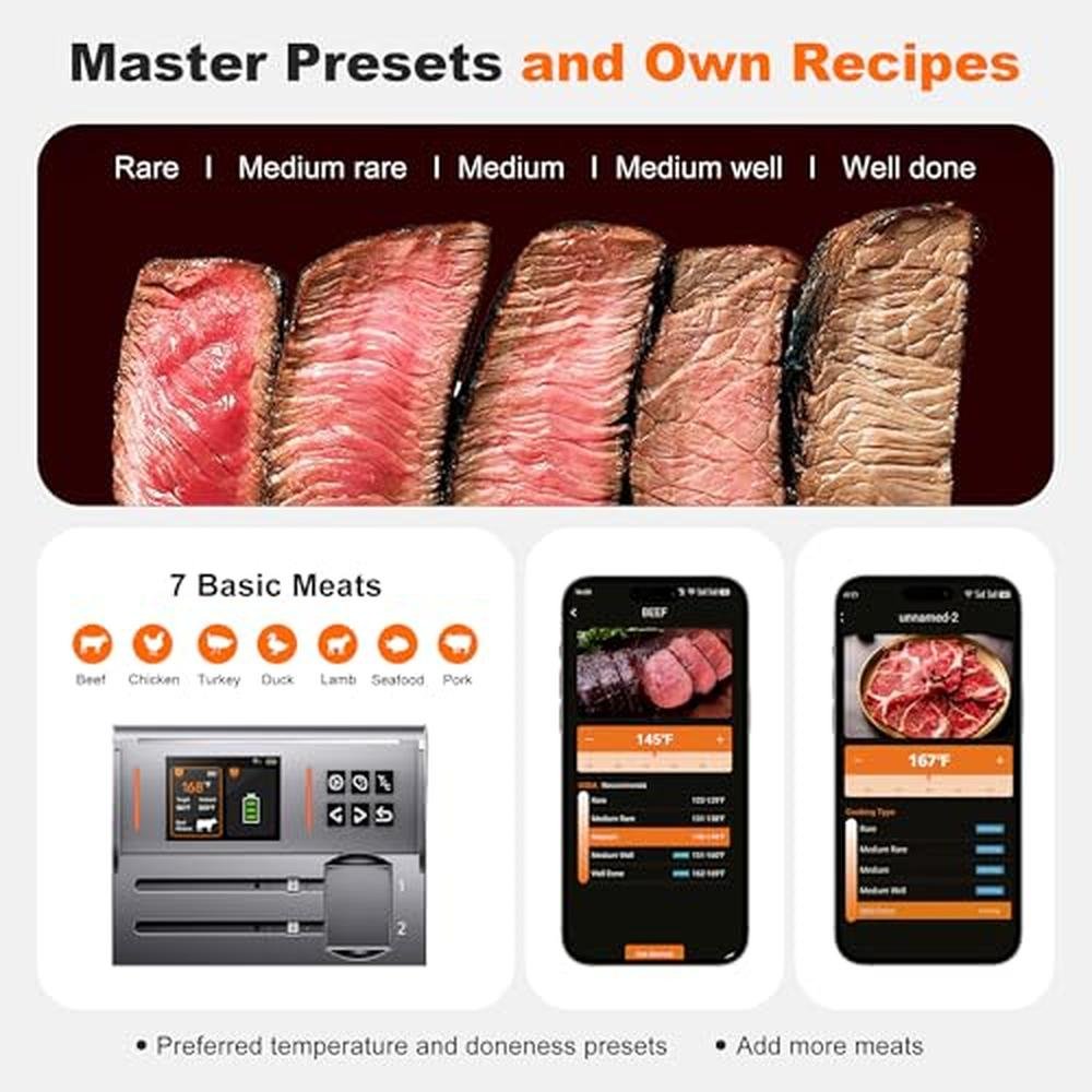 Immerse yourself in the world of high-end cooking with the NIGOGOR Dual Probes Meat Thermometer, a masterpiece of modern culinary technology. This deluxe device is engineered to provide unparalleled accuracy and reliability, ensuring that your dishes are cooked to perfection every time. Whether you're a grill master, a BBQ enthusiast, or a smoking aficionado, this premium meat thermometer is the perfect companion for your culinary adventures, offering real-time readings, remote tracking, and wireless connectivity.