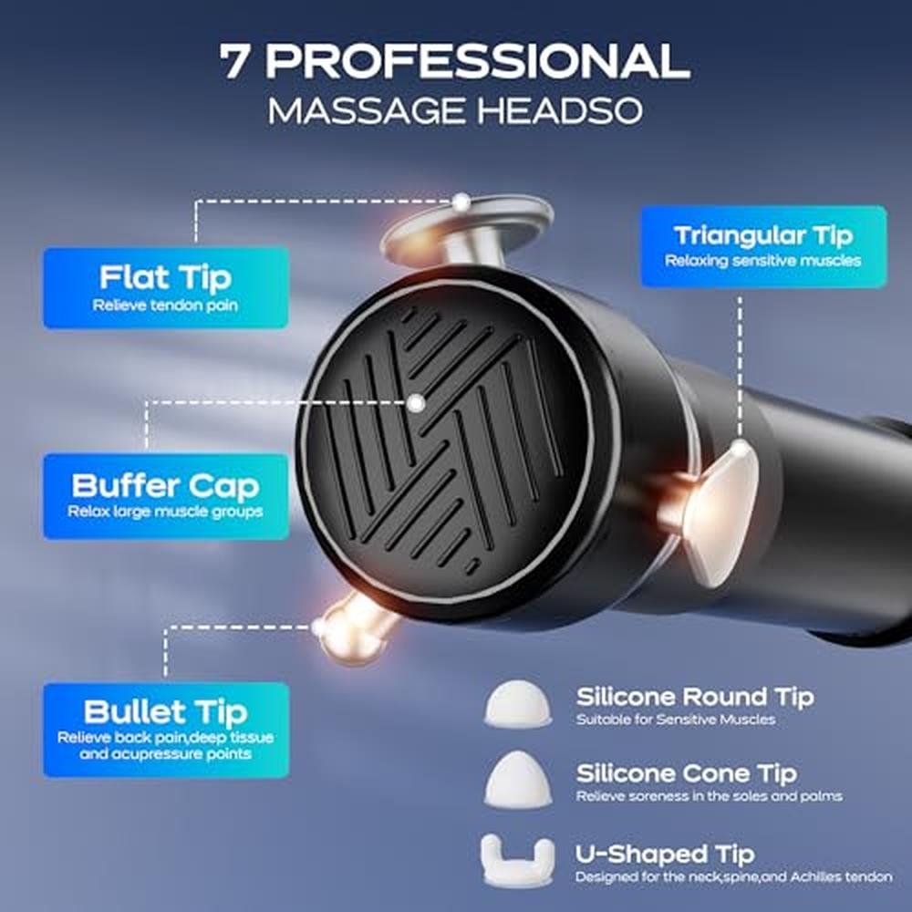 - 7 Massage Heads including 4 built-in and 3 interchangeable silicone heads for various muscle groups