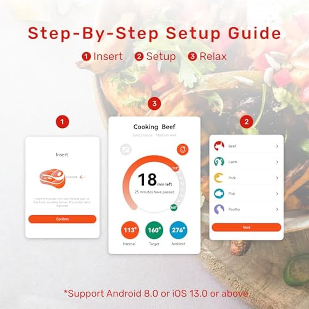 | SKU | BMUser-friendly: Turns on automatically right out of the Booster. No account or WiFi setup required, the wireless meat thermometer is pre-paired and simply connects to the app. The step-by-step instructions built into the APP make cooking a breeze, just follow the steps and you'll be done |