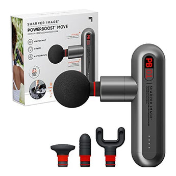 Indulge in the ultimate relaxation and muscle recovery experience with the Sharper Image Percussion Massage Gun, Powerboost Move. As a premium brand in innovative wellness solutions, Sharper Image offers this sophisticated, lightweight, and portable massager, perfect for targeting deep tissue muscle soreness and pain relief. With 4 interchangeable attachments and 4 adjustable speeds, you can curate your massage experience to suit your needs, whether it's for your back, shoulders, or full body. The Sharper Image Percussion Massage Gun stands out for its ease of use and versatility, making it an excellent choice for those seeking a high-end massager. Recovery is at your fingertips with this premium-grade massage gun, allowing you to get back in the game more quickly without worry of stiff muscles. The Sharper Image Powerboost Move massager is the post-workout recovery tool you need and the muscle repairer you deserve. This state-of-the-art massage gun uses percussion to target sore muscles and tight knots, helping you unwind after a long workout. You can loosen tight muscles with a fully customizable massage, changing the strength of the percussion to suit your body's needs and help break up lactic acid before your next workout. The nodes loosen tight or stiff muscles to reduce soreness and get you back in the game quicker. Its whisper-quiet with low vibration on the ergonomic handle, so it's the most comfortable massage gun you will find anywhere. Take it with you to the gym, on vacation, or to your next game. Target any muscle with interchangeable nodes, changing up your massage by swapping out the nodes. Use the flat one to cover more surface area or pinpoint a trouble spot with the cone attachment. Whichever you choose, you will get a customized massage every single time. The compact size of the Powerboost Move packs a punch when it comes to power, with a 2-hour runtime per charge ensuring you have sufficient battery life for thorough muscle relaxation, making it the perfect travel or gym companion.