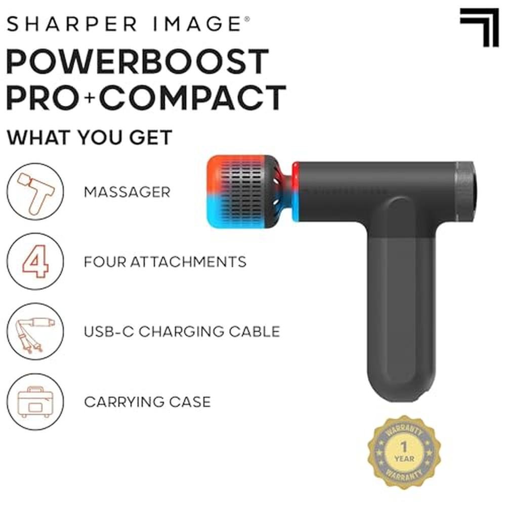 Elevate your sports recovery routine with the Powerboost Pro+ Compact, featuring exceptional deep tissue percussion massage, a revolutionary dual-temperature attachment, and easy-to-use dial control with LED display. The package includes the Powerboost Pro+ Compact, 4 attachments, a USB-C charging cable, and a carrying case. With its low competition keywords like 'cold plunge sharper image' and 'hot cold sharper image', this product is a top choice for those seeking effective cold therapy and deep tissue massage.