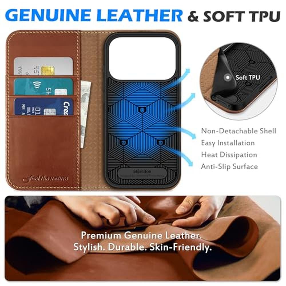 Shieldon Genuine Leather Wallet Case for iPhone 17 Pro 6.3 2025 | Premium Flip Cover with Magnetic Closure and RFID Blocking | Ultimate Protection and Style