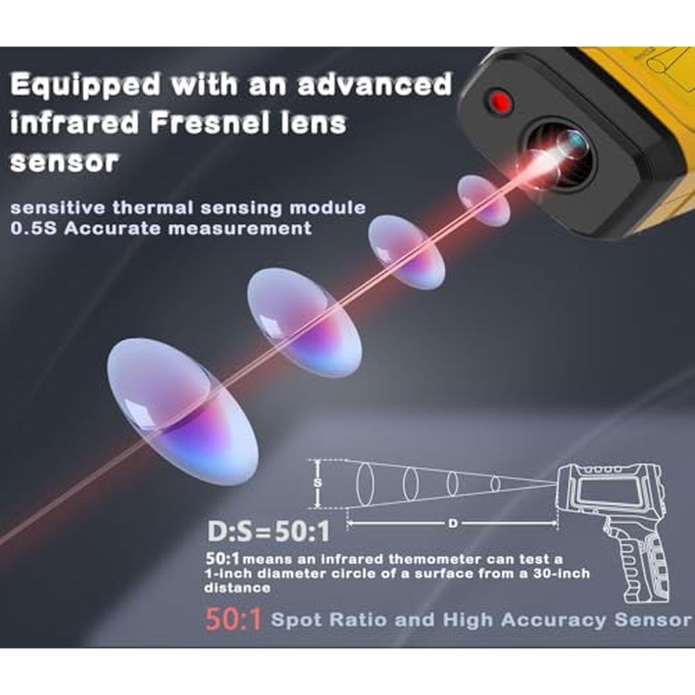 Experience the ultimate in temperature measurement with the Surpeer Infrared Thermometer Pyrometer, a premium-grade, high-precision temperature gun designed for versatility and accuracy. With a wide temperature range of -58F to 1796F and a 50:1 distance ratio, this laser IR temp gun is perfect for various applications, including cooking, pizza oven management, engine diagnostics, kilns, forges, industrial settings, and home repair. The Surpeer temperature gun offers a reliable and efficient way to measure temperatures, making it an essential tool for professionals and DIY enthusiasts alike. Its advanced infrared technology and laser guidance ensure quick and accurate readings, allowing you to make informed decisions in your work or hobby. Whether you're a chef, mechanic, or craftsman, the Surpeer temperature gun is the perfect companion for any task. With features like ultra-clear screen, wide temperature range, automatic shutdown, 13-point laser, adjustable emissivity, temperature recording, temperature difference measurement, temperature alarm, max-min measurement, multifunctional mode, fast refresh, auto off, low battery indicator, and high accuracy data storage, this temperature gun is the ultimate solution for all your temperature measurement needs.