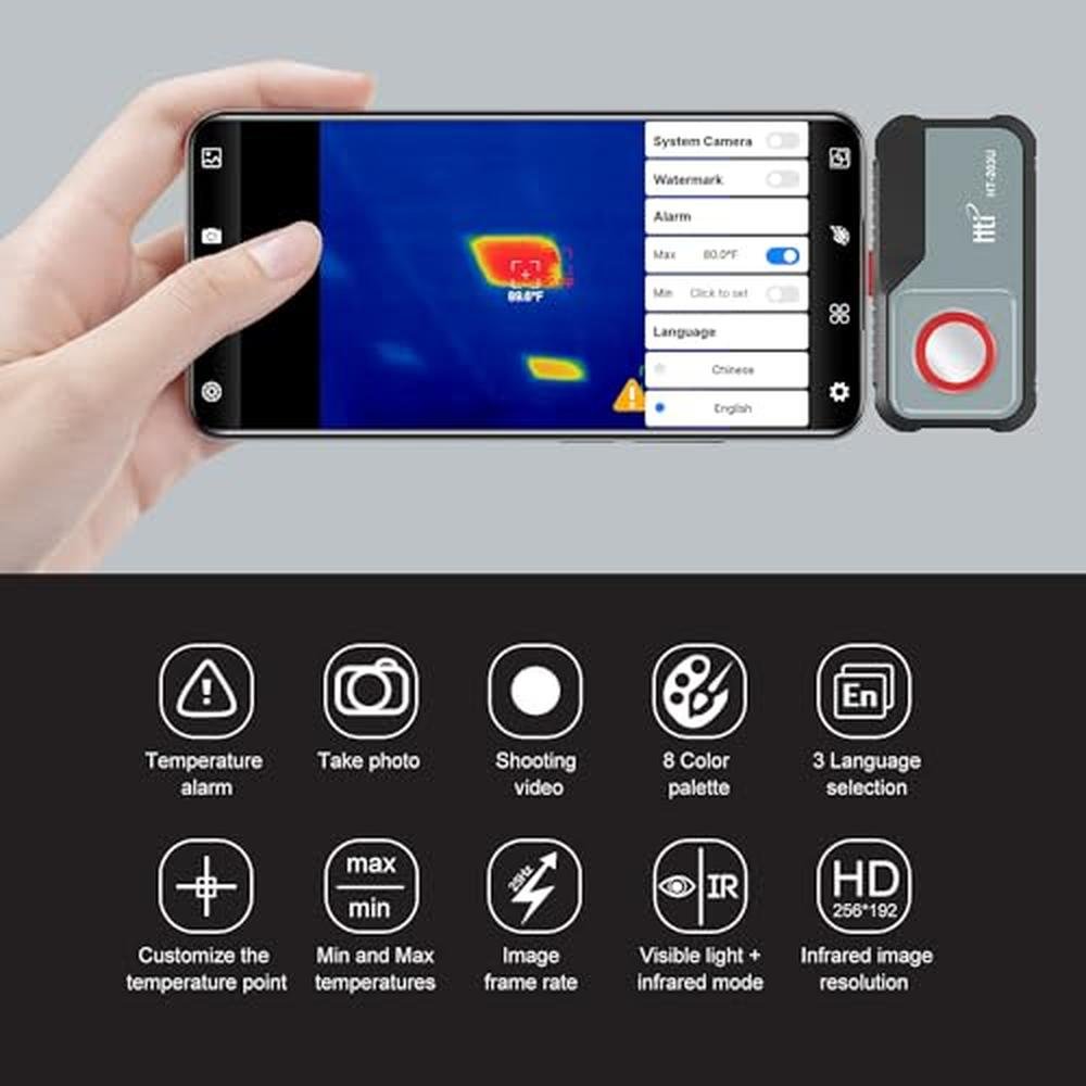 Thermal Camera 256X192 IR Resolution HT-203U Thermal Imager for Android Phone - Vanadium Oxide Uncooled Infrared Focal Plane, ISR 512x384 Image Super-Resolution Fully Adjustable,50Hz Temp Alarm