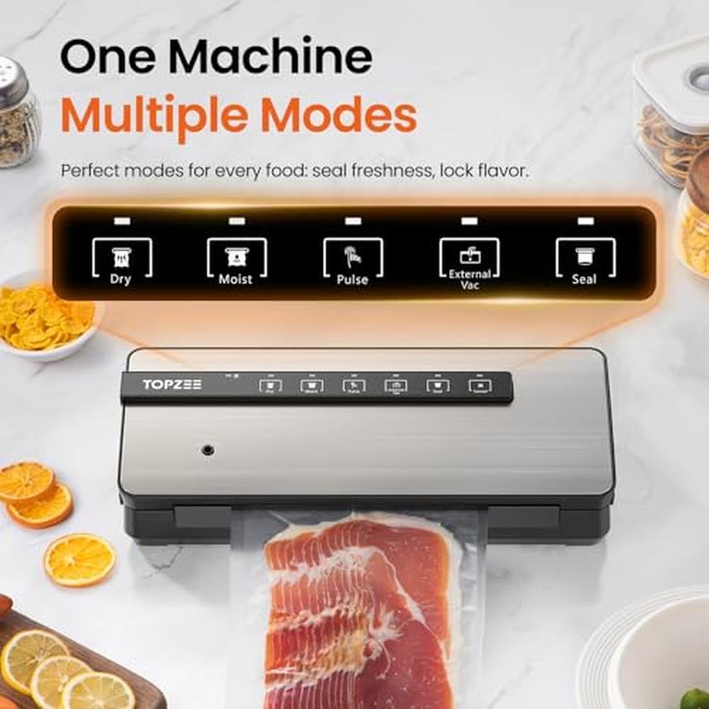 Indulge in the world of advanced food preservation with our TOPZEE vacuum sealer, featuring a 5-in-1 food preservation machine that keeps your food fresh for longer. With its Dry & Moist modes, Pulse control, and External vacuum function, this machine is ideal for a variety of foods and storage needs. The versatile sealing options allow you to choose from Dry or Moist modes for precise sealing of different foods, while the Pulse mode gives you extra control for delicate items.