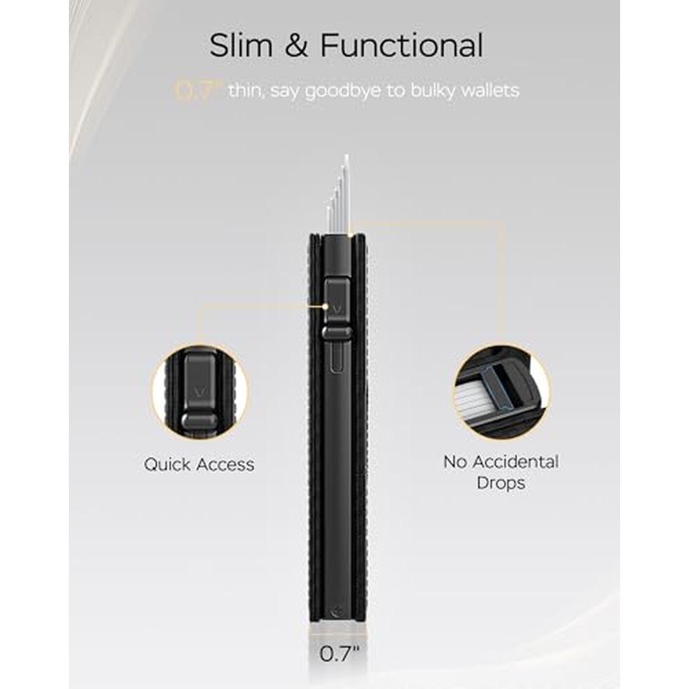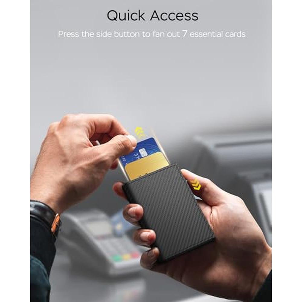 - Quick Access: Equipped with a smart pop-up design - press the side button, and 7 cards fan out in a stepped pattern for easy access on any occasions. After use, push the cards back they lock securely and stay organized