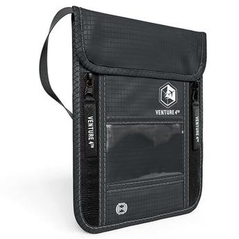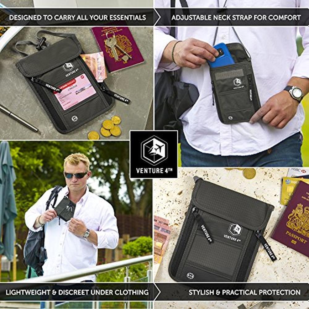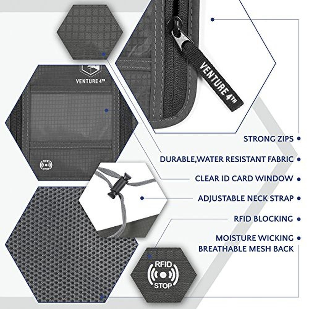 VENTURE 4TH Neck Wallet, RFID Blocking Passport Holder for Travel Hidden Neck Pouch with 6 Compartments, Slim Lightweight Organizer with Adjustable Strap for Cash, Cards & Passport (Gray)