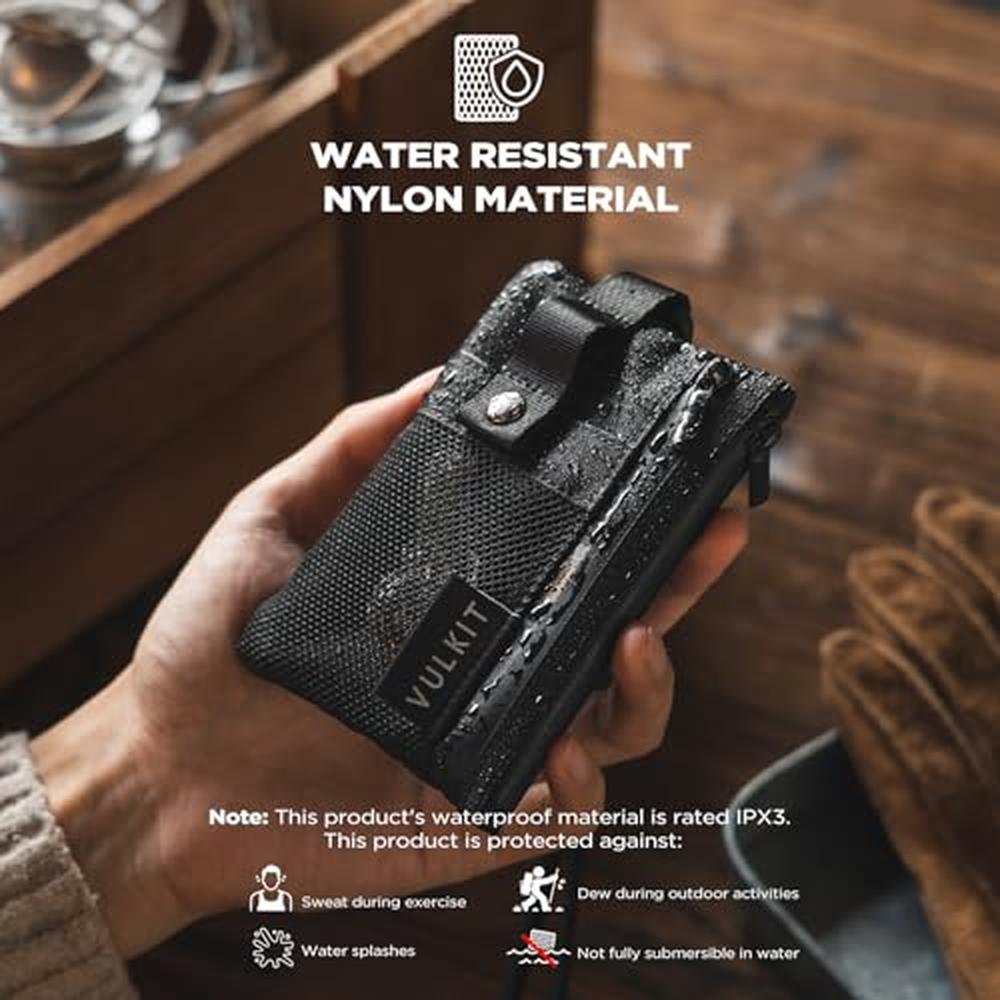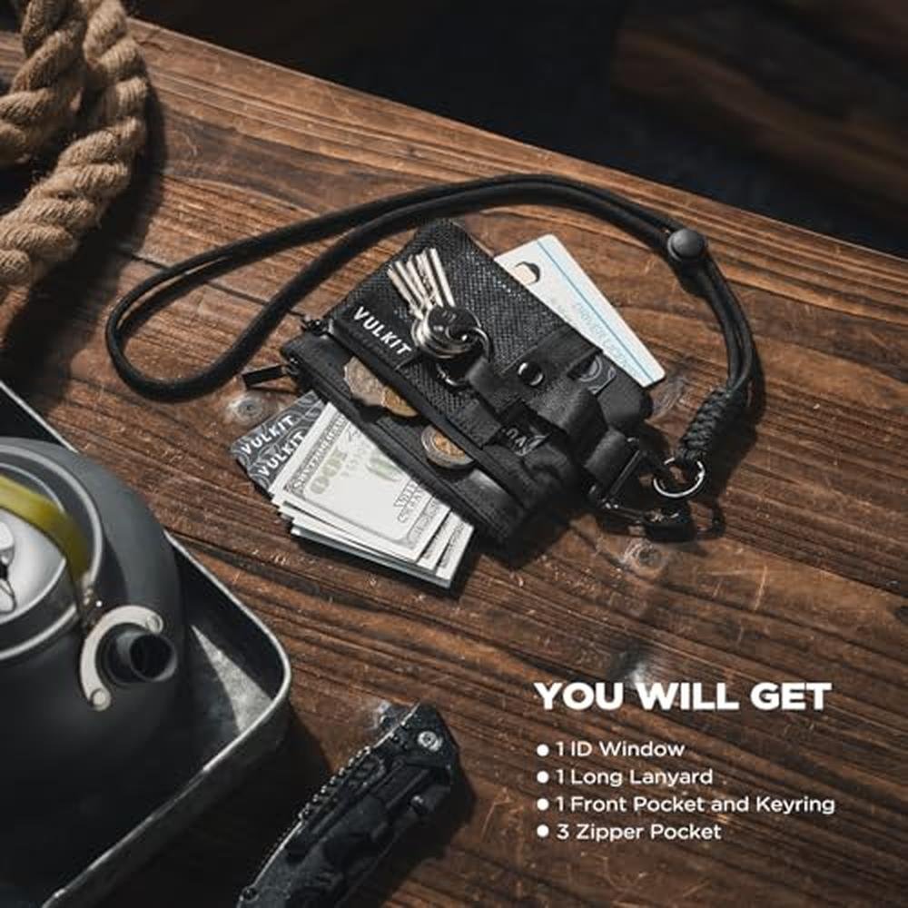 VULKIT Small RFID Wallet for Women & Men Minimalist Zipper Wallet with ID Window, Keychain & Carabiner, Holds 15 Cards, Water Resistant Travel Lanyard Wallet Black