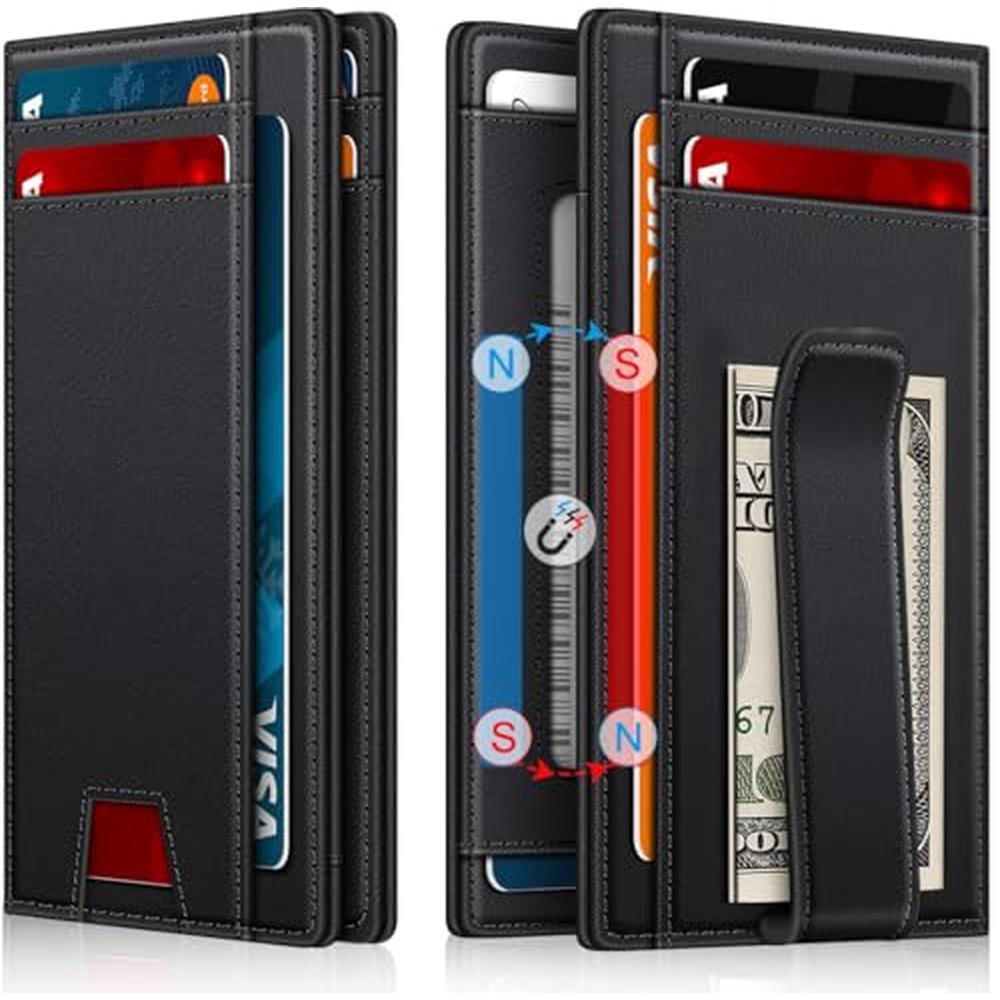 Wallet for Men 14-16 Cards, Minimalist Men Leather Wallet, Men's Front Pocket Bifold Wallets with Money Clip, Slim Thin Card Holder RFID Blocking Bill Folder & Magnetic Closure, Gifts for Men, Black