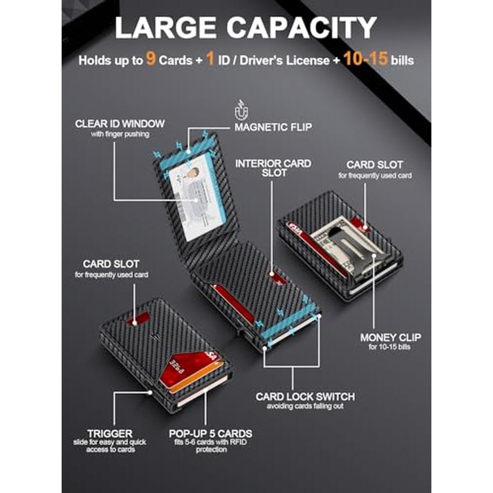 Advanced RFID Blocking Security Safeguard your sensitive information with our RFID wallet for men. The built-in shielding technology effectively blocks unauthorized scans, protecting credit cards and IDs from digital theft. This essential security feature makes it a reliable men's wallet for the modern world. Effortless One-Touch Card Access Simply press the button on the side, and your most-used card instantly pops up for quick scanning. This innovative mechanism makes our card holder wallet the ultimate front pocket wallet for men, designed for speed and convenience in busy environments. Compact But Large Capacity This compact wallet for men intelligently holds up to 13 cards in its card slots and features a built-in money clip that securely grips up to 10 bills. The easy-access ID window eliminates the need to remove your license, making it a highly functional credit card holder and men's wallets solution. Ultra-Slim & Front Pocket Design Crafted from premium microfiber and lightweight aluminum alloy, this slim wallet for men is engineered for comfort. Its remarkably thin profile slides effortlessly into any front pocket. Enjoy the freedom of a minimalist wallet for men that feels almost invisible. The Perfect Gift for Men This front pocket wallets for men is practical and stylish gift for men. Its combination of sleek design, innovative pop-up function, RFID protection, and ample storage makes it an ideal card wallet or men wallet gift choice for birthdays, Father's Day, graduations, or any occasion.