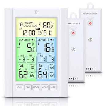 | SKU | BMUpgrade Triple Color-Zoned Display for Enhanced MonitoringOur upgrade refrigerator thermo-hygrometer features a unique triple color display - light yellow for indoor conditions, green for Channel 1, and blue for Channel 2. Monitor temperatures and humidity across all areas at a glance, with dedicated zones ensuring clear visibility of each area's conditions |