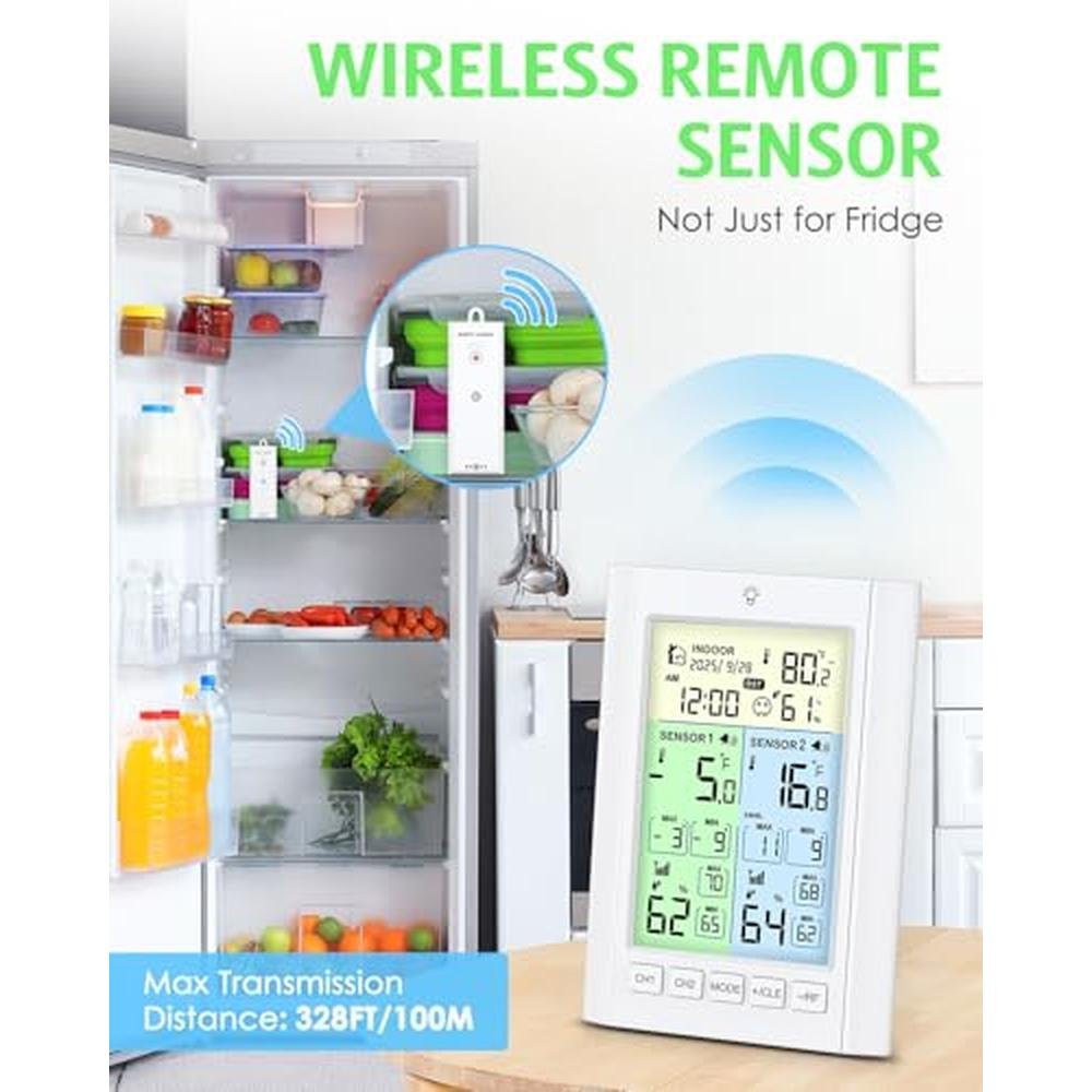Immerse yourself in the world of advanced temperature monitoring with this dual-channel refrigerator thermo-hygrometer, which measures temperature and humidity in both fridge compartments (refrigerator and freezer) as well as indoor conditions. The color-coded display features dedicated zones: light yellow for indoor data, green for Probe 1, and blue for Probe 2. The screen simultaneously displays real-time readings, min/max records, and supports easy viewing without switching via buttons. It also shows comfort icons, time, DST, calendar, and offers two history modes (24hr/All Time). Dual power options include 3AAA batteries (not included) or USB cable (included), with adjustable backlight settings. A magnetic pad (separately packed) allows easy attachment to refrigerators. Additional features include temperature alarm alerts and a one-touch alarm setting check function.
