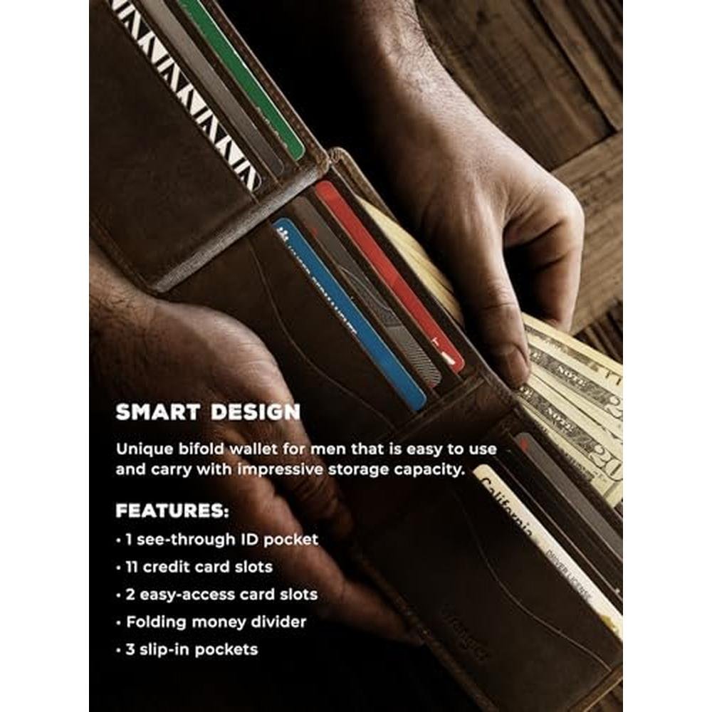 - Smart Design : This bifold wallet for men has a unique easy to use and carry design with an impressive storage capacity: 1 see-through Id pocket, 11 credit card slots which you can double up, with 2 easy-access card slots with thumb access, folding divider, 3 slip-in-pockets, and an airtag pocket with window for easy removal when a charge is needed and a secure snap to make sure it isnt sliding anywhere when put back into place.