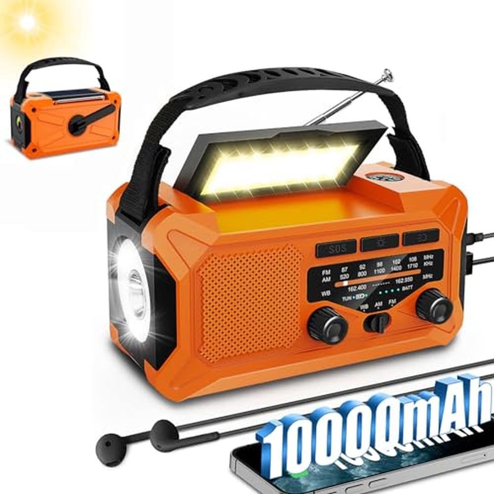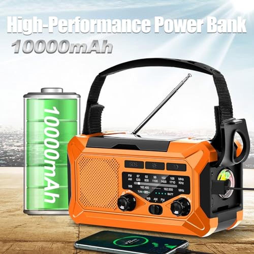 10000mAh Emergency Radio,Multi-Function AM/FM/NOAA Weather Radio,Hand Crank,USB Cable 3 Charging Methods,SOS Alarm,Flashlight,Phone Charger,Compass,Reading Lamp(Tangerine)