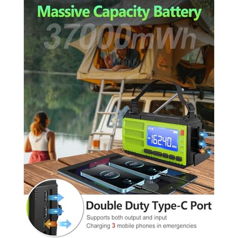 - [Power Up with 37000mWh Battery & 3 Outputs]: This upgraded hand crank radio comes with a robust 37000mWh battery and 3 outputs (The Type-C port supports both output and input) , making it an essential tool during power outages. The hand crank radio can charge 3 mobile phones simultaneously, ensuring you have the power to communicate with loved ones or access emergency services when it matters most.