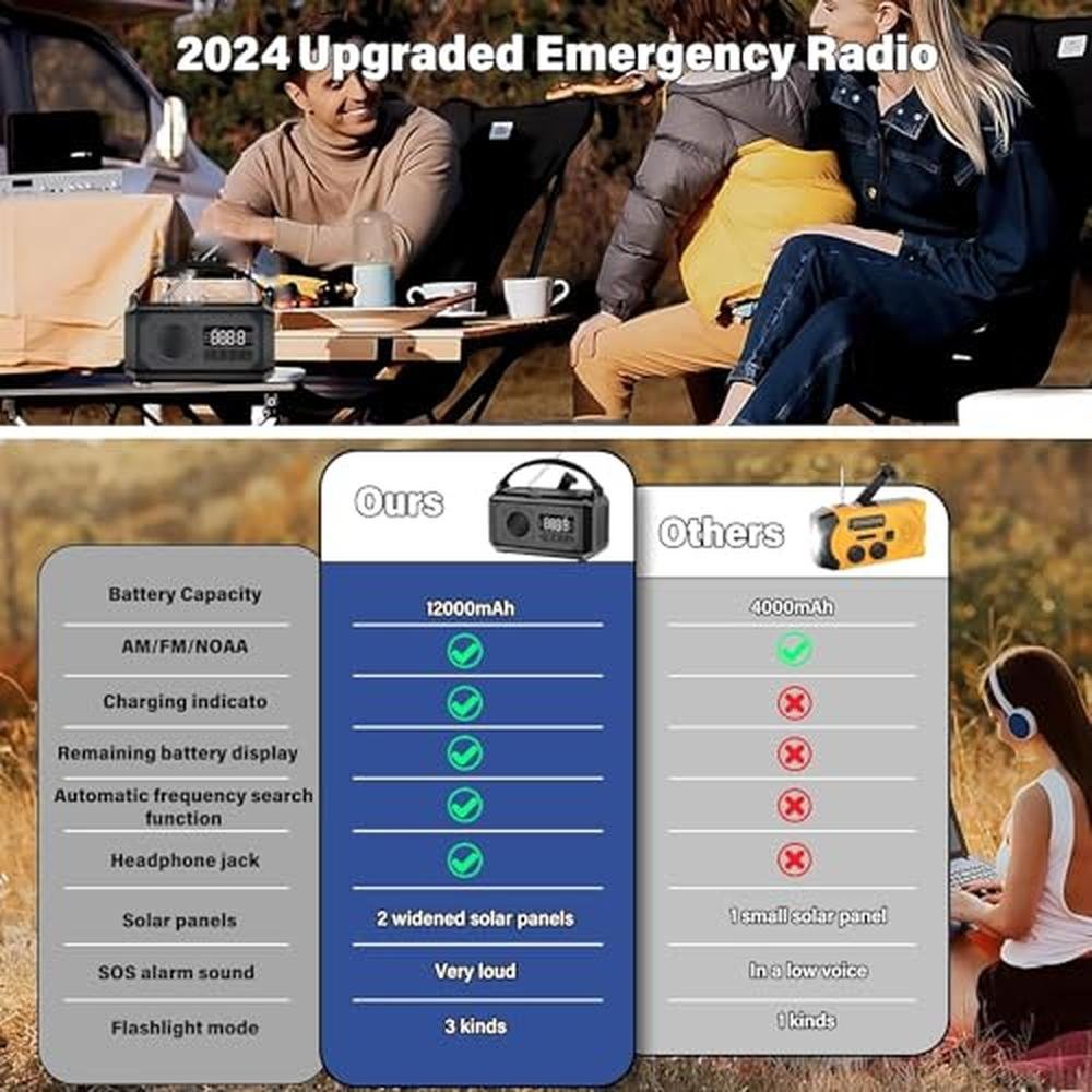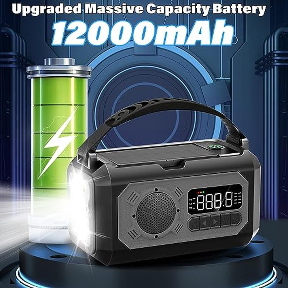 • Leading the Trend with 12,000mAh Ultra Capacity and Dual Solar Panels: Say goodbye to the limitations of ordinary emergency radios. Revolutionize your emergency preparedness with our 12,000mAh Solar Radio! Featuring the market's largest battery capacity, stay connected with your devices during critical times. With dual solar panels for unmatched efficiency, our hand crank radio ensures reliable charging wherever you are. Embrace the future of emergency communication