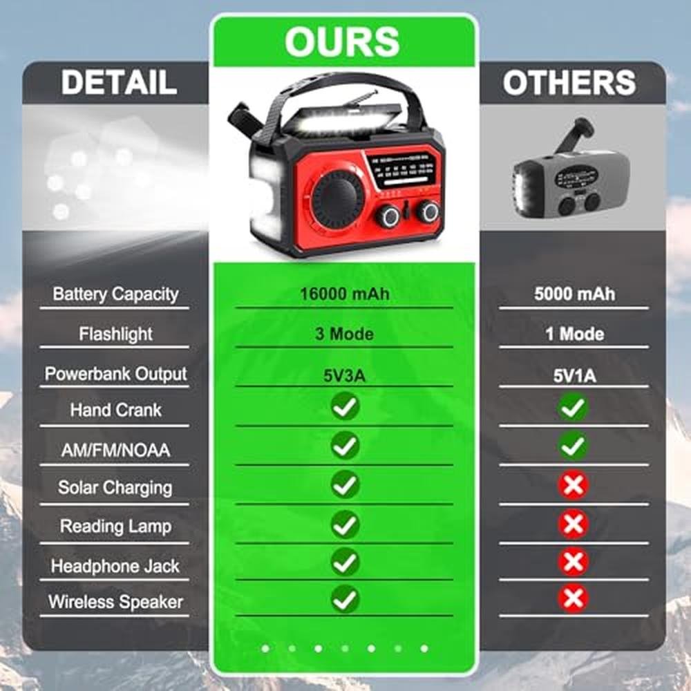 - SUPER 16000MAH BATTERY - This emergency radio is equipped with a high-quality and super-capacity lithium battery. Very efficient in both charging and discharging. He can charge your cell phone, which is equivalent to a 16000mAh power bank
