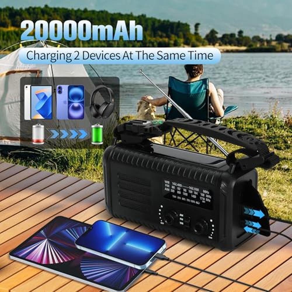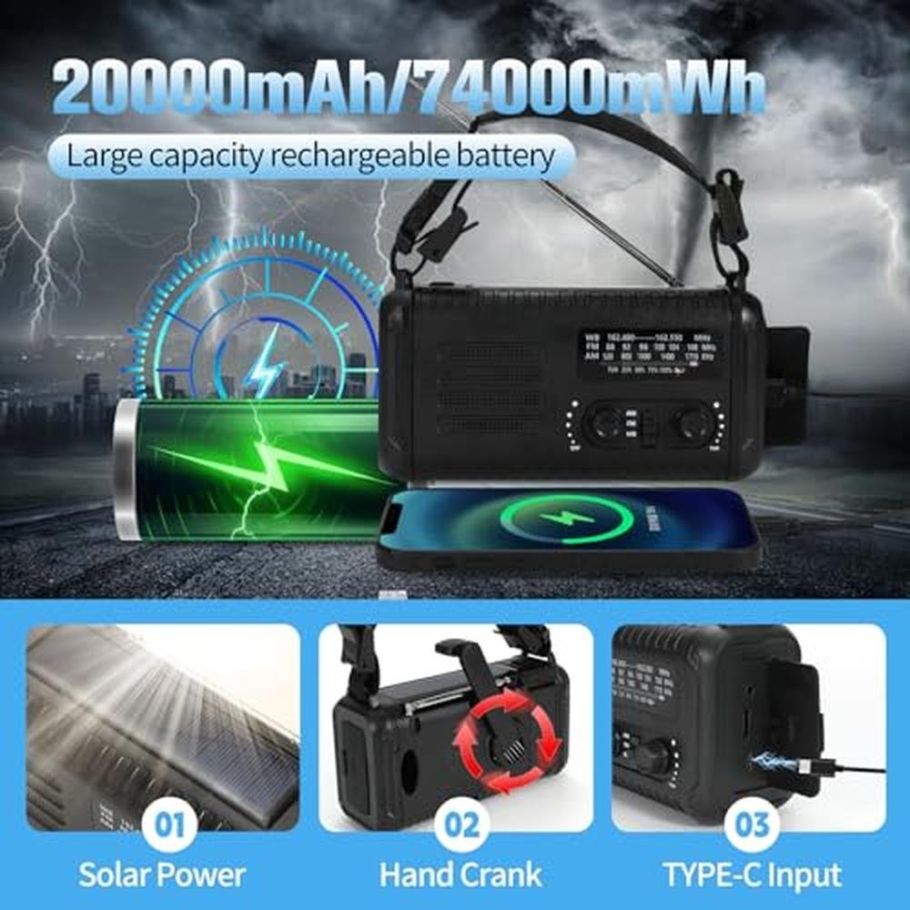 20000mAh / 74000mWh Emergency Crank Radio, NOAA/AM/FM Portable Weather Radio, Solar Hand Crank Radio, Battery Powered with USB Phone Charger, Flashlight Reading Lamp & SOS for Survival Camping (Black)