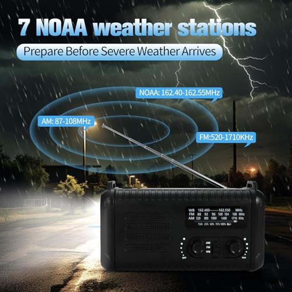 - High sensitivity reception of broadcast signals The emergency crank radio adopts a newly upgraded extended antenna and advanced DSP chip design, which can easily capture the latest information and warnings from NOAA (162.400-162.550MHz), AM (520-1710Khz), FM (87-108MHz) and other radio stations, reminding you of dangerous weather such as hurricanes, tornadoes, and severe storms in your area. The large volume knob design facilitates volume adjustment, and the 3.5mm headphone jack is thoughtfully designed, allowing you to immerse yourself in radio programs alone.
