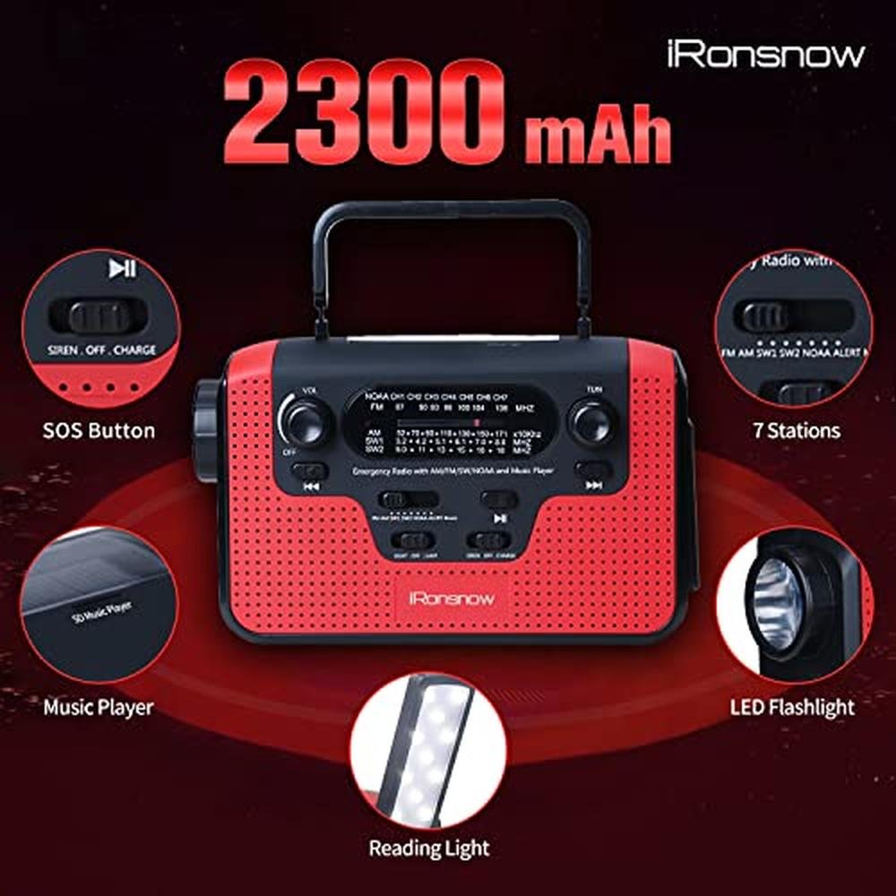 2300mAh Solar Hand Crank Emergency AM/FM/SW/NOAA Radio, Real NOAA Alert Weather Radio with SOS Alarm, TF Card Speaker, LED Flashlight & Reading Lamp, Phone Charger for Camping, Emergency