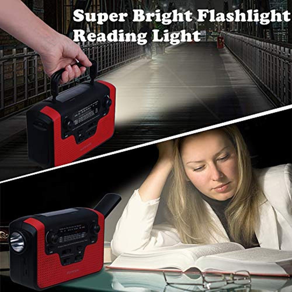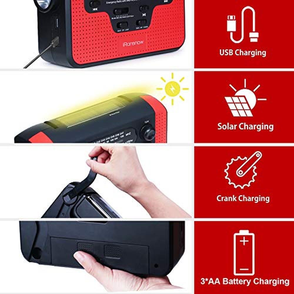 - 4-WAY Power Sources: The solar crank radios with multiple power backup options. 4 Power Source including USB Charging, Hand Crank, Solar Panel, Built-in Li-ion Rechargeable Battery, to make it easier to keep the emergency radio running during a prolonged situation where power is off and batteries have been used up. Never Power outage!