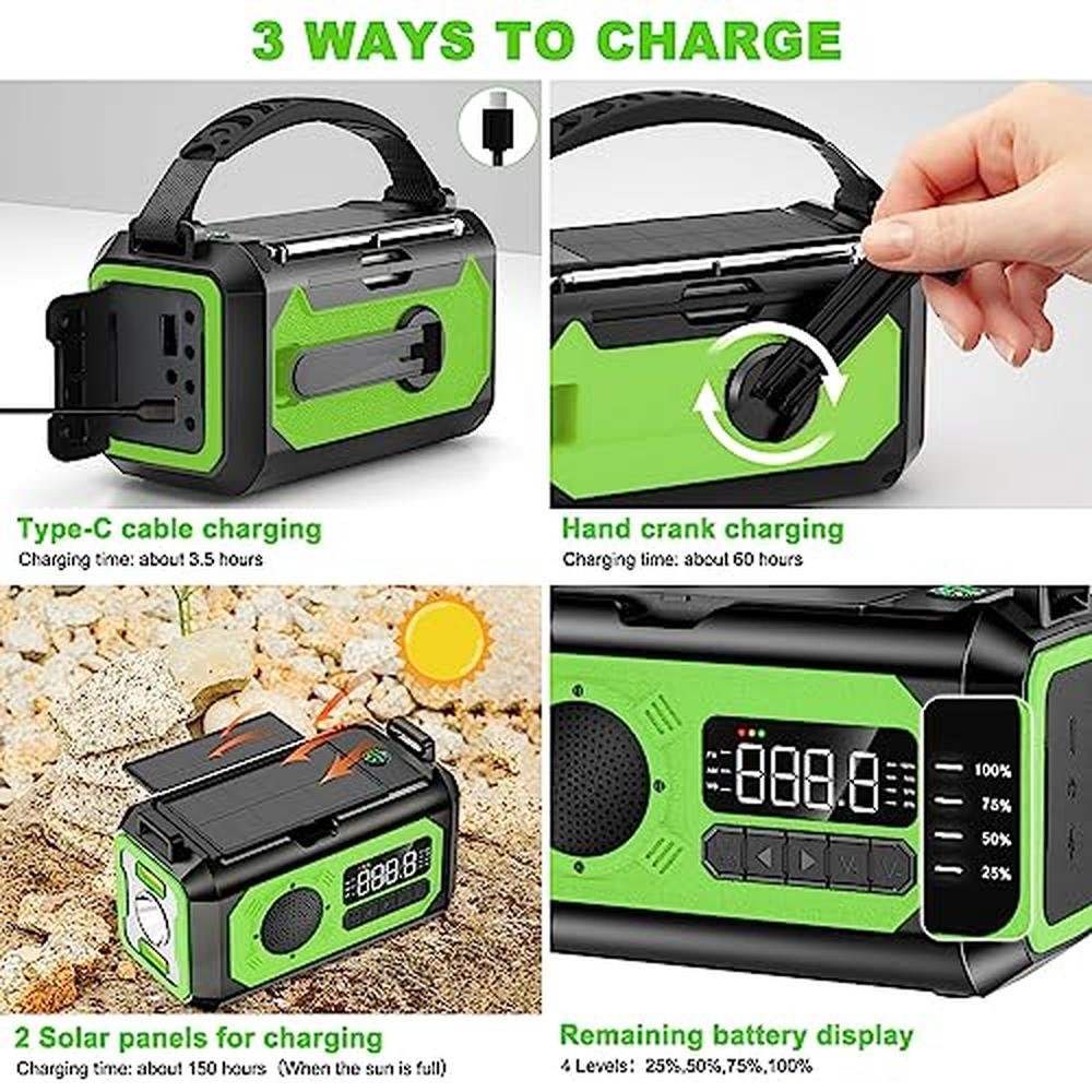 - 12000mAh Super Capacity Battery & 3 Charging Modes With a built-in 12,000mAh battery, the radio is capable of providing emergency power to any small tablet or other device such as a phone. With 3 charging modes: Type-C charging, solar charging, and hand crank charging, you can always have power no matter where you are or what situation you are in. With two large solar panels, it is superior to radios on the market for charging efficiency and speed.