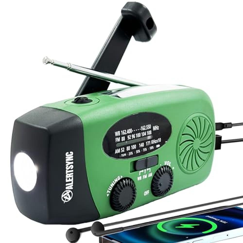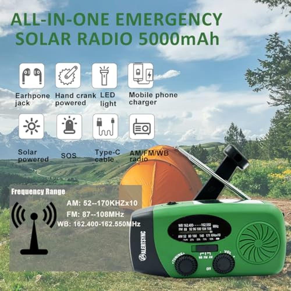 5000mah Alertsync NOAA Weather Emergency Radio with Solar Charging, AM FM Hand Crank Windup Radio SOS Alarm LED Flashlight with Earphone Jack for Home, Camping, Survival Hurricane (Green)