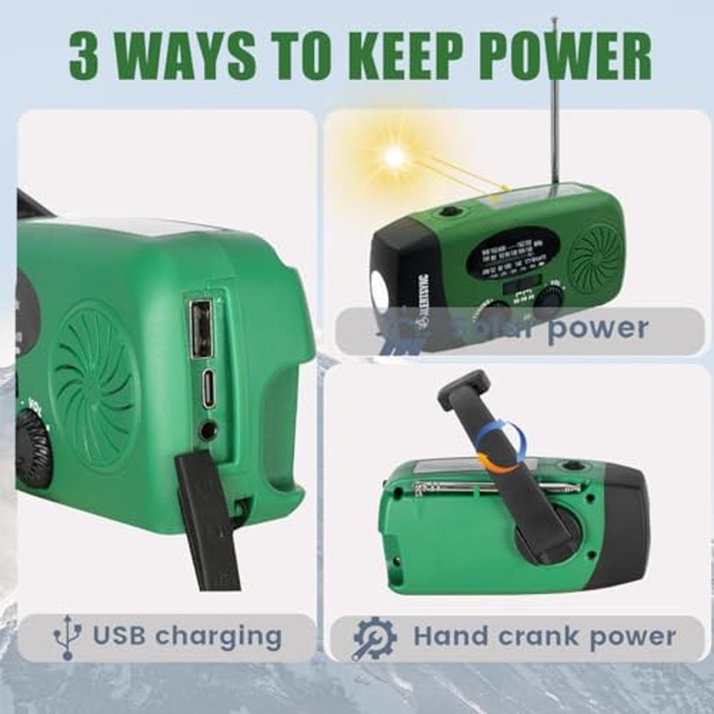 - 5000mah NOAA weather radioit will broadcast the latest emergency weather alerts in your area such as hurricanes, tornadoes and severe storms, emergency radio keep your household prepared for the unexpected weather emergency. alsocan use 5000mah power bank to charge for your smart phone and other electronic products. Provides up to 24 hours of light or 7-8 hours of radio time. No matter what the emergency situation, it will support to you.