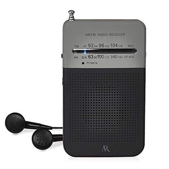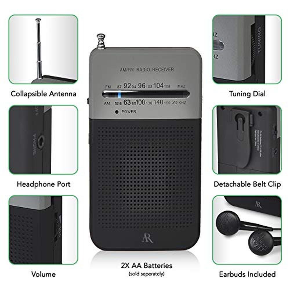 Acoustic Research Portable AM/FM Radio Black and Grey Rubberized Finish with Belt Clip, Built-in Speaker and Earbuds; Battery Operated