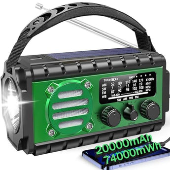 • 20000mAh Emergency Battery | 72-Hour Survival Charging Station--Industry-leading 20000mAh polymer battery charges an iPhone 14 Pro 5 times or powers the radio for 48+ hours. Triple charging options: solar panel, hand crank, and Type-C fast charging. 5 minutes of cranking = 30 minutes of emergency calls. 4-level power indicator + digital display ensures energy control during blackouts.