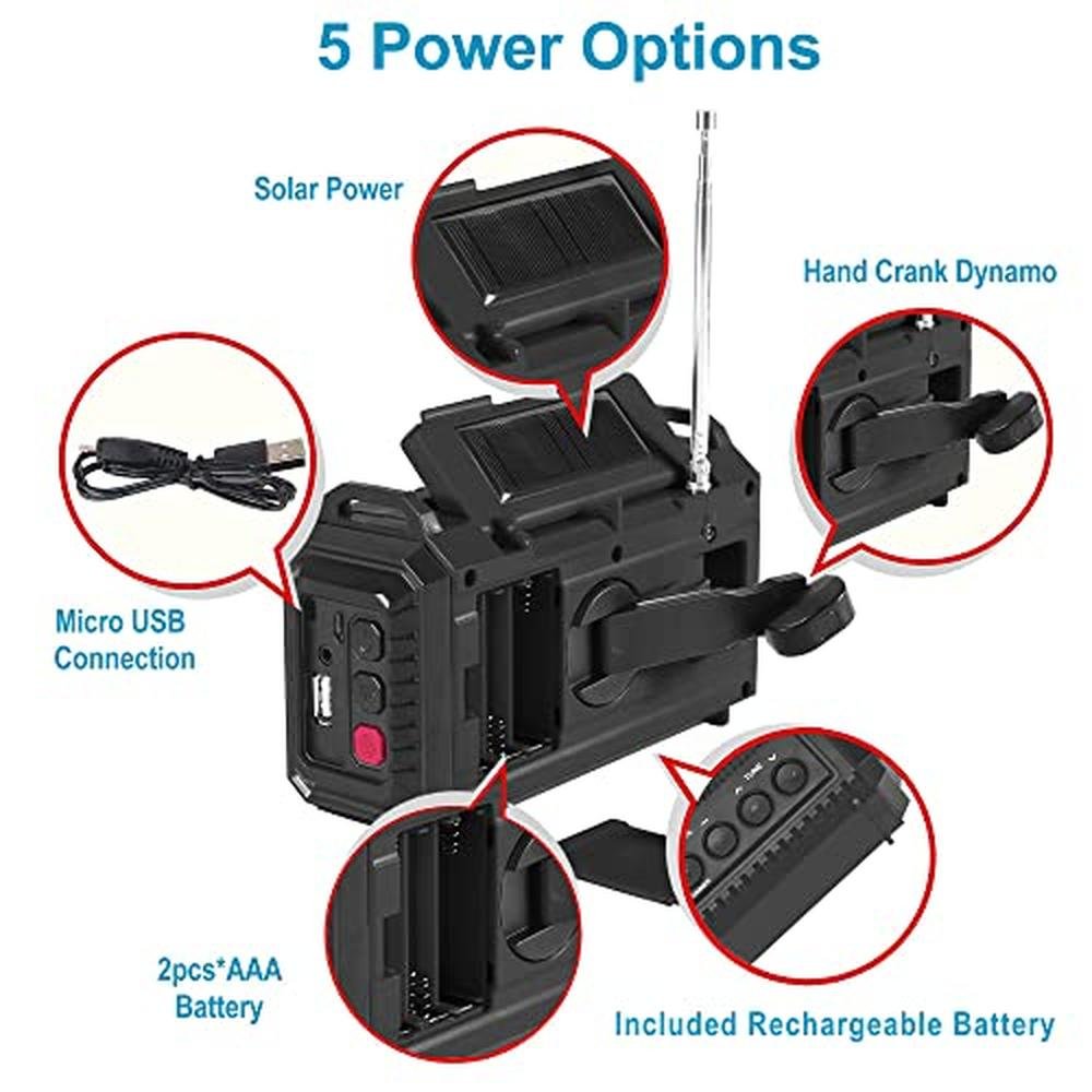 - Rechargeable Built-in Battery & 5 Power Options----This Weather radio comes with 5000 large-capacity rechargeable Li-ion battery can charge more than one cellphone in emergecy.5 power options, never worry it power off anytime. When the built-in li-ion battery is power off, it will effortlessly charge via the backup power sources include manual winding up handle, solar panel, micro USB input connection or 3 pcs AAA battery.