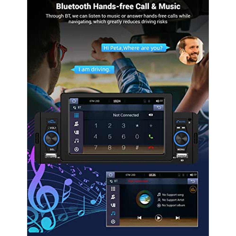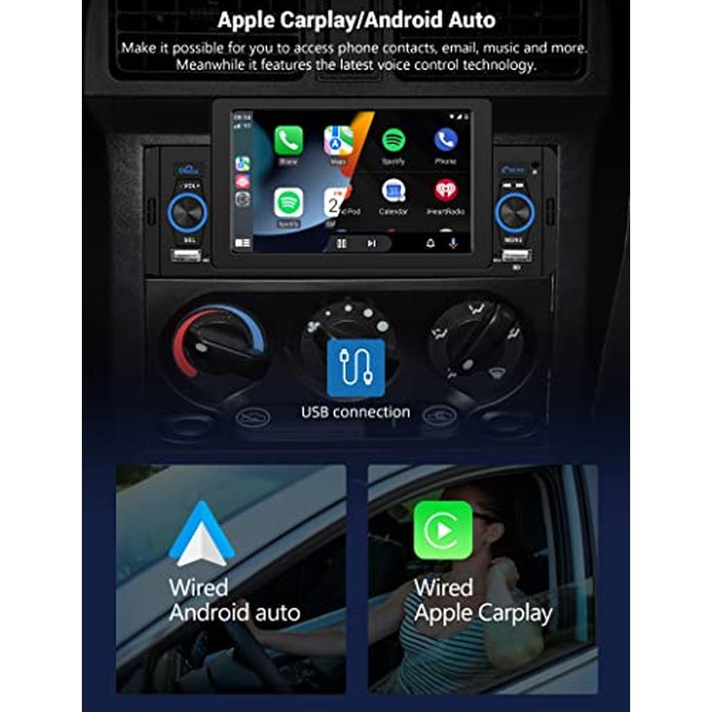 - Single Din Touchscreen Radio: Apple carplay single din Car audio receiver system with 5 inch capacitive touchscreen, navigation can be displayed on the screen in high definition. Two USB, TF and AUX-in ports on front panel, multi color LED backlight physical buttons make it easier to use while driving, especially the rotating volume control and fast-forward /backward knobs