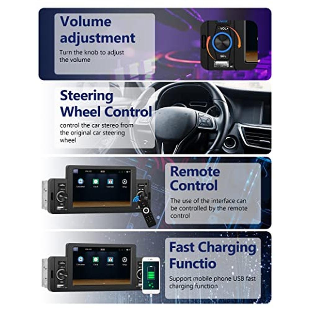 METEESER 5 Inch Touchscreen Single Din Car Stereo with Carplay/Android Auto/Backup Camera ,single din android autoCompatible with Car Play/Android Auto/Phone Mirror-link 5 Inch Touch Screen 5 Inch capacitive touch screen with high resolution, support 1080P video playback. Bluetooth Connects to the phone's Bluetooth and downloads the phone's address book, support hands-free calling, bluetooth music. Built-in/External Mic Built-in clear mic and equipped with external mic jack,make sure you can get a clear bluetooth call, external microphone is included. FM Radio High-quality digital stereo FM radio,18 stations can be preset, you can listen to real-time radio, weather forecast, news. Backup Camera The car radio supports rear view and will display the image automatically when the vehicle shifts into reverse. HD night vision rear view camera is included. Wireless Remote Control Control every action with the included wireless remote control which is great for passengers and provides amazing accessibility. 4 Modes Input Support up to four different audio input modes, including USB/AUX/Bluetooth/TF. 7 Colors Backlit Buttons 7 colors which switch automatically, its also possible to set a unique one of your choice. Two USB Ports Two USB ports on the front panel, support phone fast charging/USB flash drive.