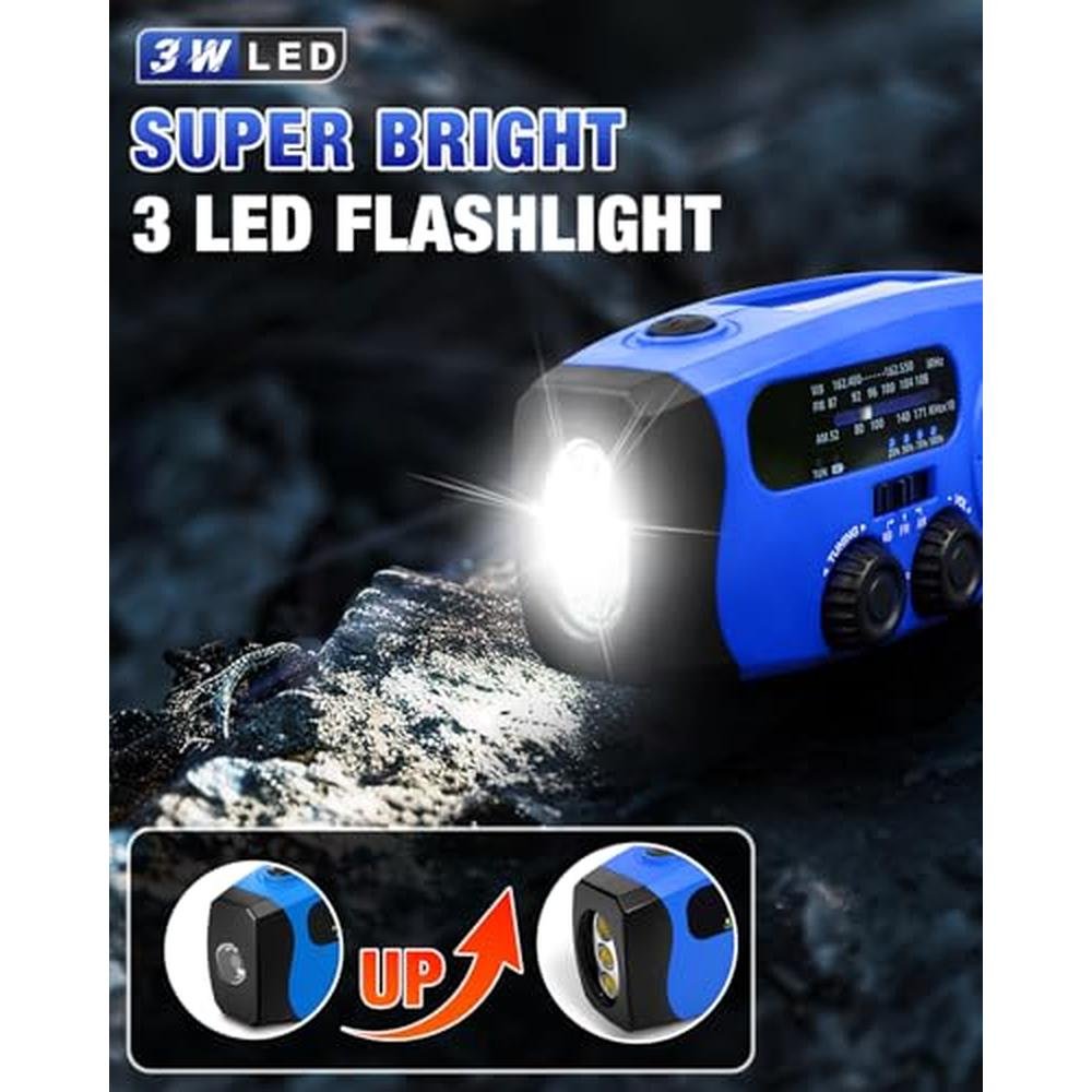 - Super Bright 3 LED Flashlight The flashlight on this emergency hand crank radio has been upgraded from a 1W single bead to a 3W 3 LED bead that provides 140LM of brightness, enough to provide you with emergency lighting in the event of a power outage.