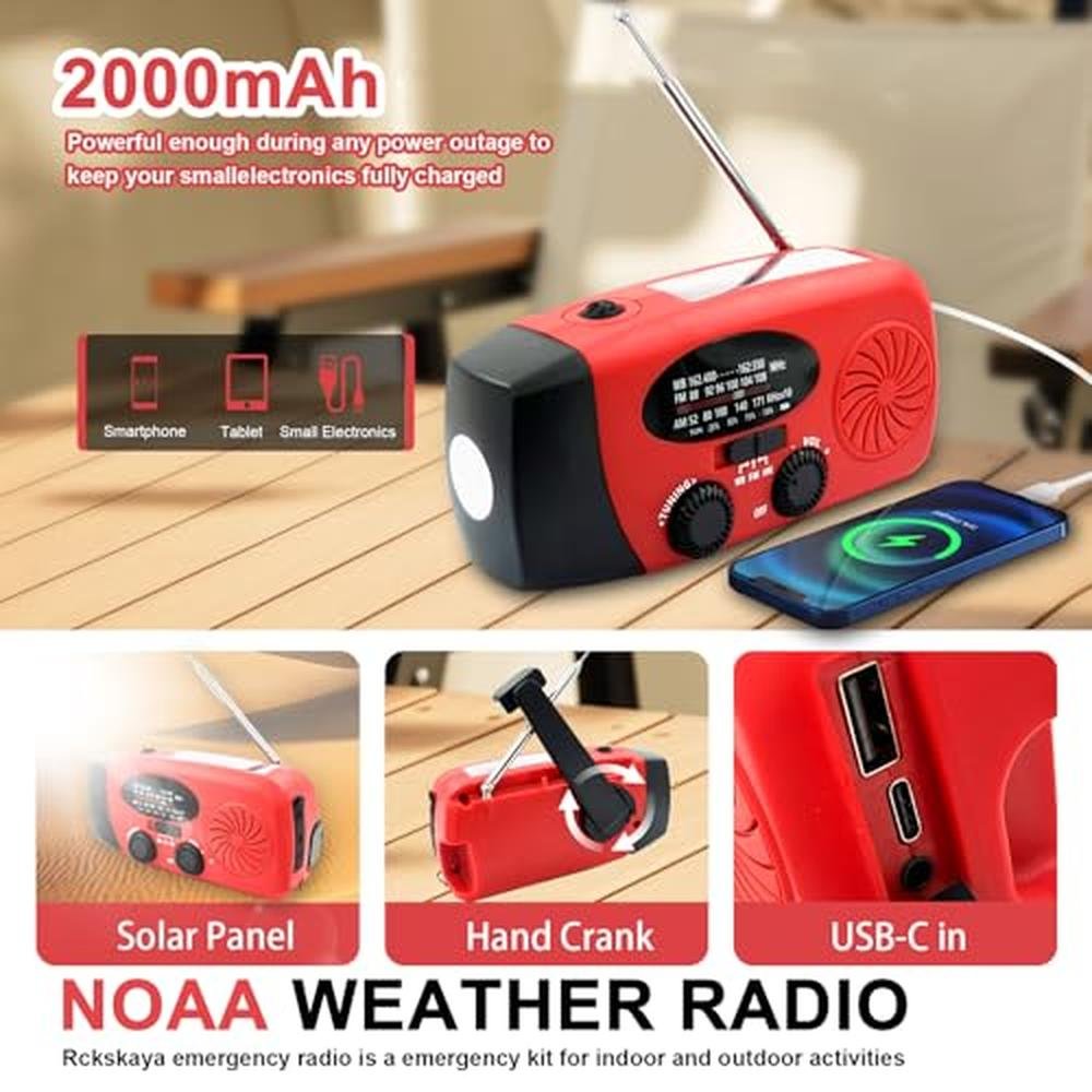 Rckskaya focuses on providing more portable and versatile emergency radios to help people take precautions in response to disasters and natural disasters. The multi-function weather emergency radio with a large battery not only provides bright light as an emergency flashlight, but the updated USB-Type port can charge 2 mobile devices via charging cable at the same time. The solar panel and hand crank charging design can charge in time even when there is no charging source.Despite the inevitable disaster, we hope that the emergency radio can give you some help