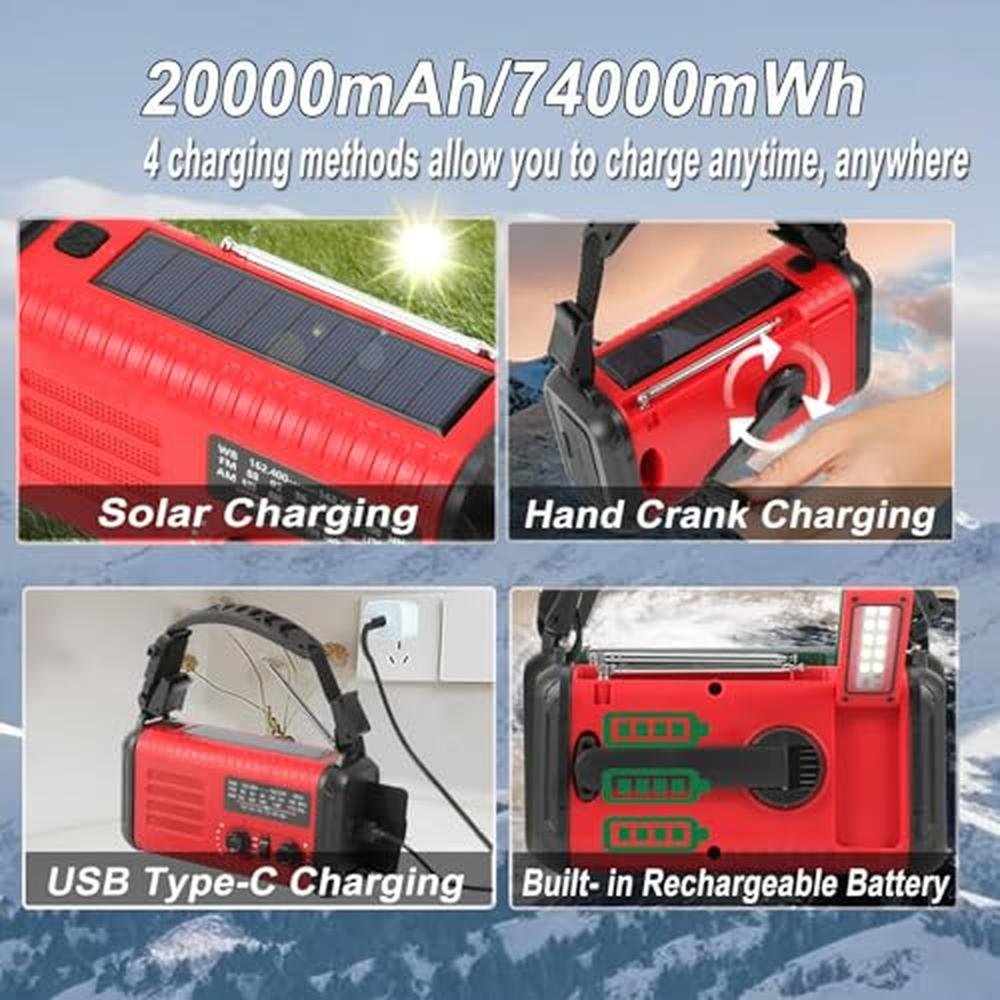 Emergency Weather Radio, 20000mAh/74000mWh Crank Radios, Solar Battery Powered Radio with AM/FM/NOAA, Portable Fast Phone Charger, Reading Lamp, SOS Alarm& Flashlight for Camping, Hiking (Red)