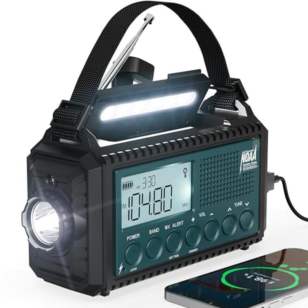 Mesqool 5000 Solar Hand Crank Emergency Radio 5 Ways Powered AM/FM/SW/NOAA Weather Alert Portable Radio Description No matter what emergency weather you are in, our hand crank emergency radio have 5 ways to power,5000 high capacity can charge your phone, receives radios from AM/FM/SW radio stations/ 7 pre-programmed NOAA weather channels. NOAA weather alert will automatically scan and sound an alarm indicating that is a life-threatening weather suitable for thunderstorm, cyclones, hurricanes, tsunamis, floods, Earthquakes, etc, earn a critical time to prepare and save you and your family. Feature 5 ways to power - hand crank power,solar power,build in Li-ion battery,AC adapter power,AAA batteries(not included) 5000 rechargeable power bank AM/FM/SW radio stations and 7 pre-programmed NOAA weather channels SOS alert 2 adjustable brightness super bright reading lamp Large LCD screen 2 level red flashlight 3.5mm headphone jack 2 backlight settings Charging cell phone or portable digital device(adapter not included) NOAA weather alert Automatic power switch function Lock button function Digital tune Easy to use Parameter NOAA:162.400 /162.425/162.450/162.475/162.50/162.525/162.55MHz AM:520-1710 KHz FM:87.00-108MHz SW:2.3-23MHz Battery:5000mAh build in lithium battery Size:172 x 94 x 63mm Weight:410g Material:ABS Water resistance:IPX3 Flshlight brightness:120-250LM Flshlight color temperature:6000-6500K Reading lamp brightness:100-150LM Reading lamp color temperature:6500-7000K Headphone jack size:3.5mm AC power input:Micro USB USB Charging Type :5V 2A Adapter (adapter not included!!) Weather alert include: 4H, 6H, 8H, 12H, 16H, 20H, 24H or ON Charging time Adapter power:6 hrs Hand crank power:17 hrs Solar Power:120 hrs Battery life Flashlight mode:250LM-12 hrs, 120LM-35 hrs Lamp mode:150LM-33 hrs, 120LM-100 hrs WB/SW/AM/FM:30 hrs WX alert:65 hrs Standby:100 hrs Power off:6500 hrs Package Include 1* Emergency radio 1* 5V 2A Cable 1* Paper manual 1* Metal hook 1* Warranty card 1* Portable Belt