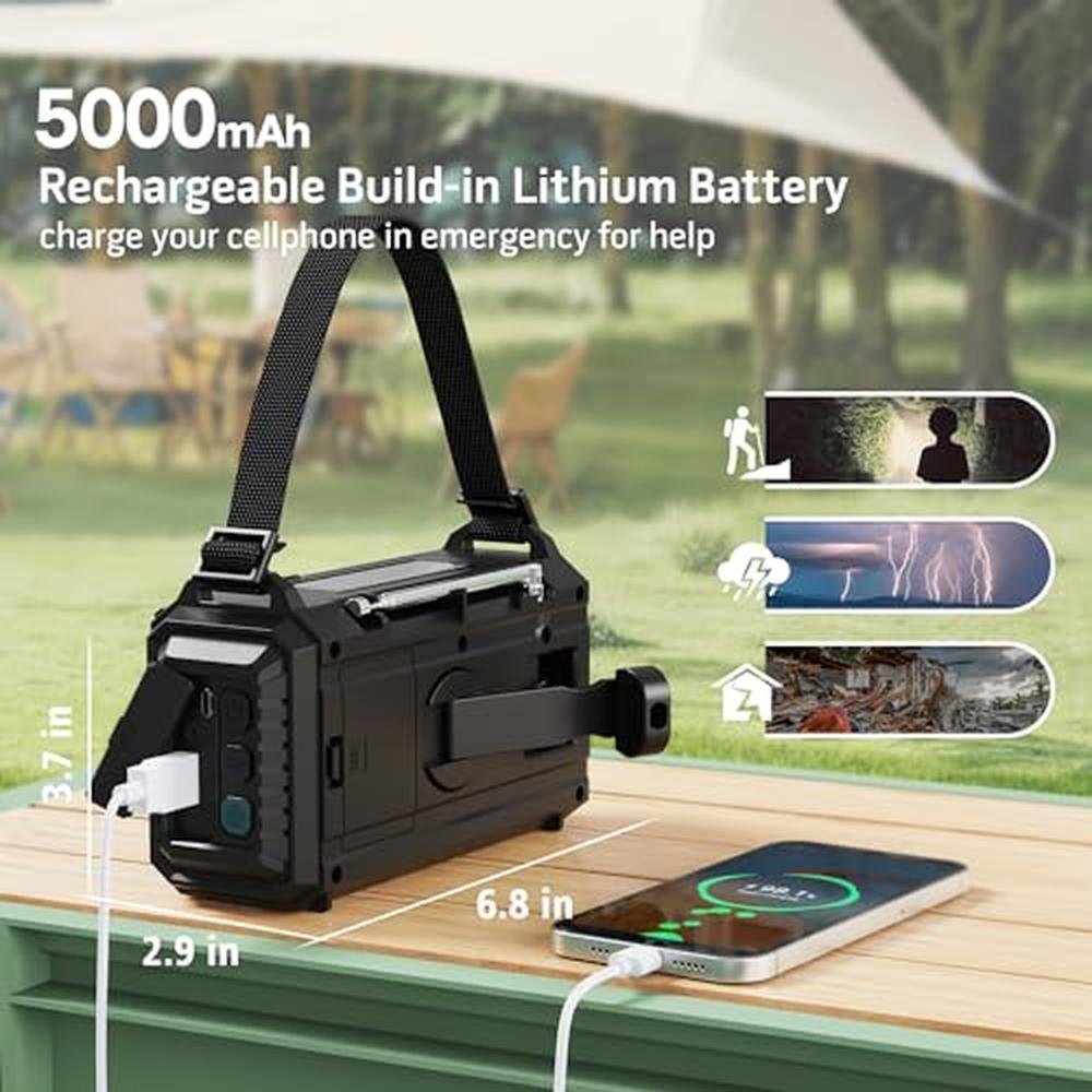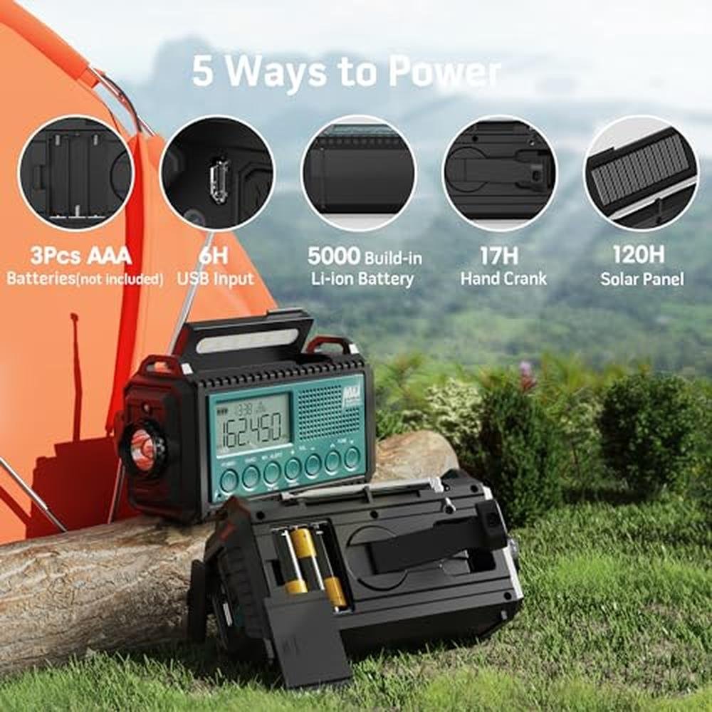 - 5-Way Power SourcesThe hand crank emergency radios have 5 charging options. 5000 built-in rechargeable lithium battery keeps all functions of the battery operated radio running, 5V USB cable(adapter not included) which provides the most efficient way to recharge portable survival radio in daily use, hand crank, solar panel, and 3 AAA batteries to keep the weather alert radio running where power outage and batteries have been used up, it suitable for hiking or camping. Never worry about running out of electricity!