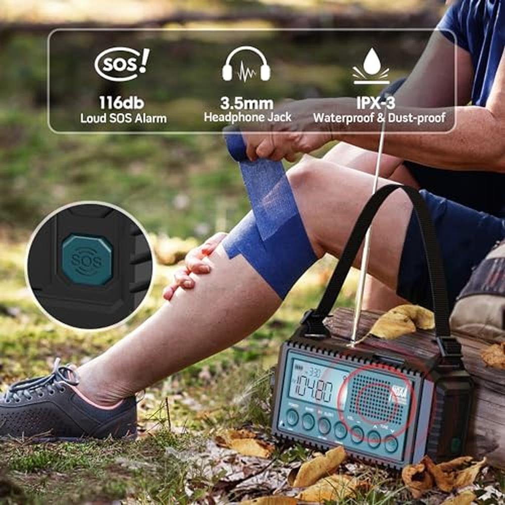 - 116db Loud SOS&Superbright Flashlight&3.5mm Headphone JackThe flashlight radio has an SOS that can sound a loud alarm to attack attention and will be rescued in time, there will be a flashing red light on in the meantime. The flashlight continuously provides 150 to 250 Lumens bright light. An earphone jack on the right side of the radio allows you to enjoy a private listening experience in a crowded and noisy environment. A must-have for casual camping, backpacking, or wilderness survival.