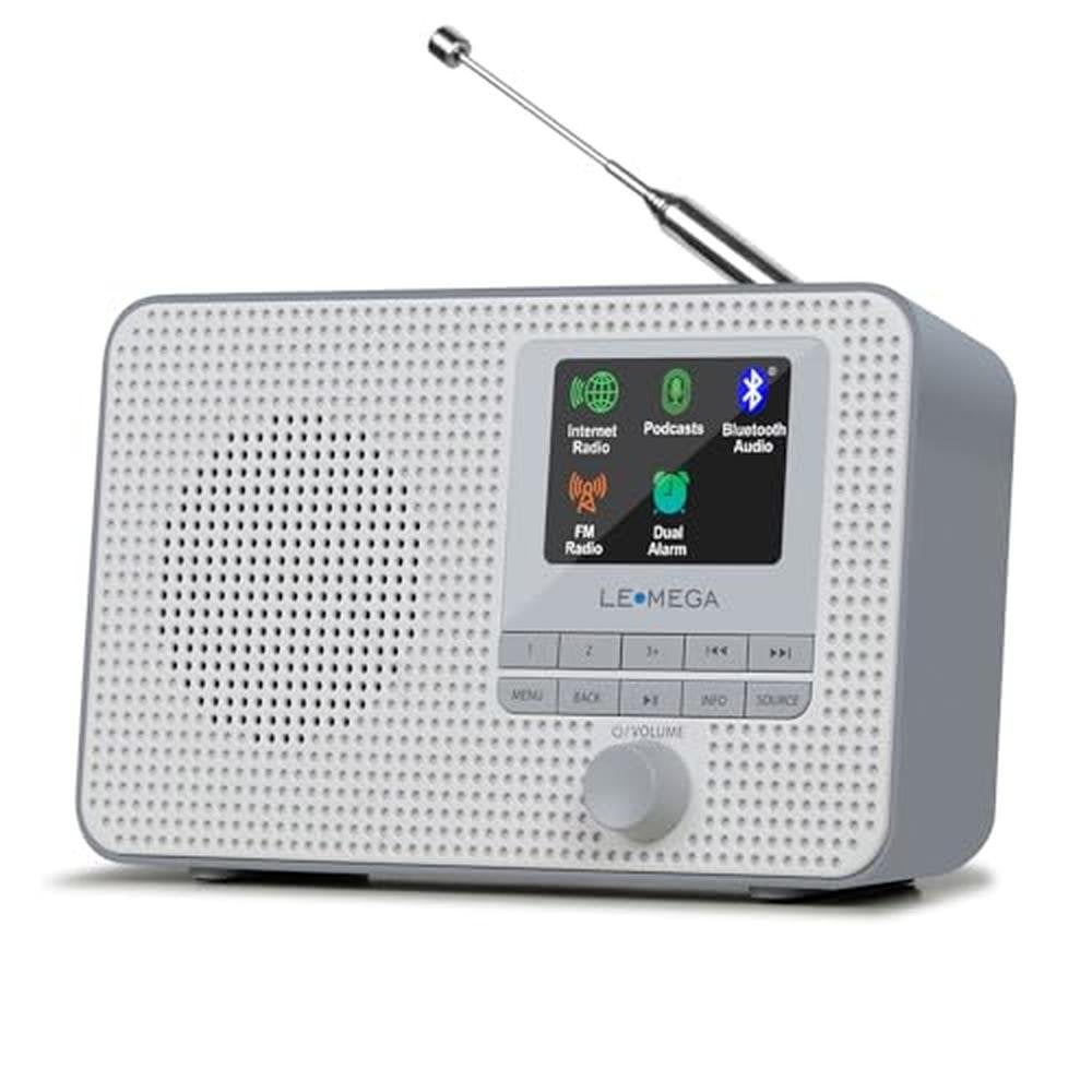 LEMEGA IR1 Portable WiFi Internet Radio, FM Digital Radio, Bluetooth, Dual Alarms Clock,Sleep Snooze Timer,40 Presets,Headphone-Output, Colour Display,Batteries or Mains Powered Grey Finish