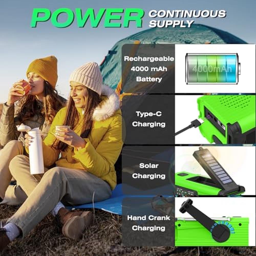 • [Continuous Power Supply]: Emergency radio is always at the ready! The powerful weather radio has 3 charging options, with a 4000mAh rechargeable battery that can be charged via USB cable, solar panel or hand crank. More convenient and reliable for instant, automatic, all-day messaging about weather alerts. Remains operational in the event of an emergency power outage