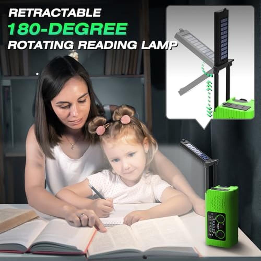 - [Multi-Functional for Emergencies]: Emergency weather radio with an ultra-bright LED flashlight and extendable 180 rotatable reading lamp that can be adjusted to any angle to illuminate a large area, keeping you out of the dark during emergency power outages or at night. Loud SOS alarm and eye-catching flashing light to call for help in emergency to escape from any danger. Solar crank radio can charge your phone, tablet and USB devices to provide emergency power