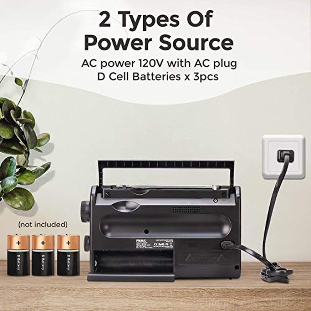 - A Big "Heart" in the State of Power OutageBecause the D battery is the alkaline battery with the largest capacity. In the event of a power outage, Powered by three brand-new 1.5v D batteries(not included), the radio can last over a month (about 36 days) with 2 hours of usage time every day. It basically solves most of the problems caused by power outages. When there is electricity available, the radio can be powered by an AC plug(included), perfect for using in living room, kitchen and office.