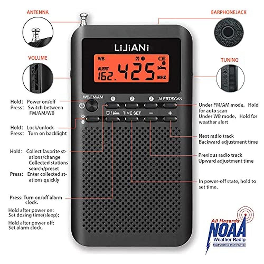 Our radio with AM/FM/ NOAA weather Alert radio.can automatically or manually get weather broadcasts from 7 NOAA stations at a crystal-clear sound. This weather radio can automatically monitor and alert hazard weathers in your area like hurricanes, tornadoes and sever storms, earns a critical time for you to get full preparation advance, keeping you and your family safe with this noaa radio. Small size:4.9*2.7*0.8 IN, convenient for you to carry or put in thee mergency bag. Powered by 2 AA batteries, even in power outage you still can receive weather information from this portable transistor radio, keep you update with lasted news. when the battery is taken out, The time memory will belost in 30 seconds. Please install a new battery within 30 seconds. Please donot turn on the backlight when changing the battery. The package does not contain batteries. Please purchase AA batteries separately FM: 87-108 MHZ AM: 520-1710 KHz NOAA Weather:162.400/ 162.425/ 162.450/ 162.475/ 162.50/ 162.525/ 162.55 (continuous band)