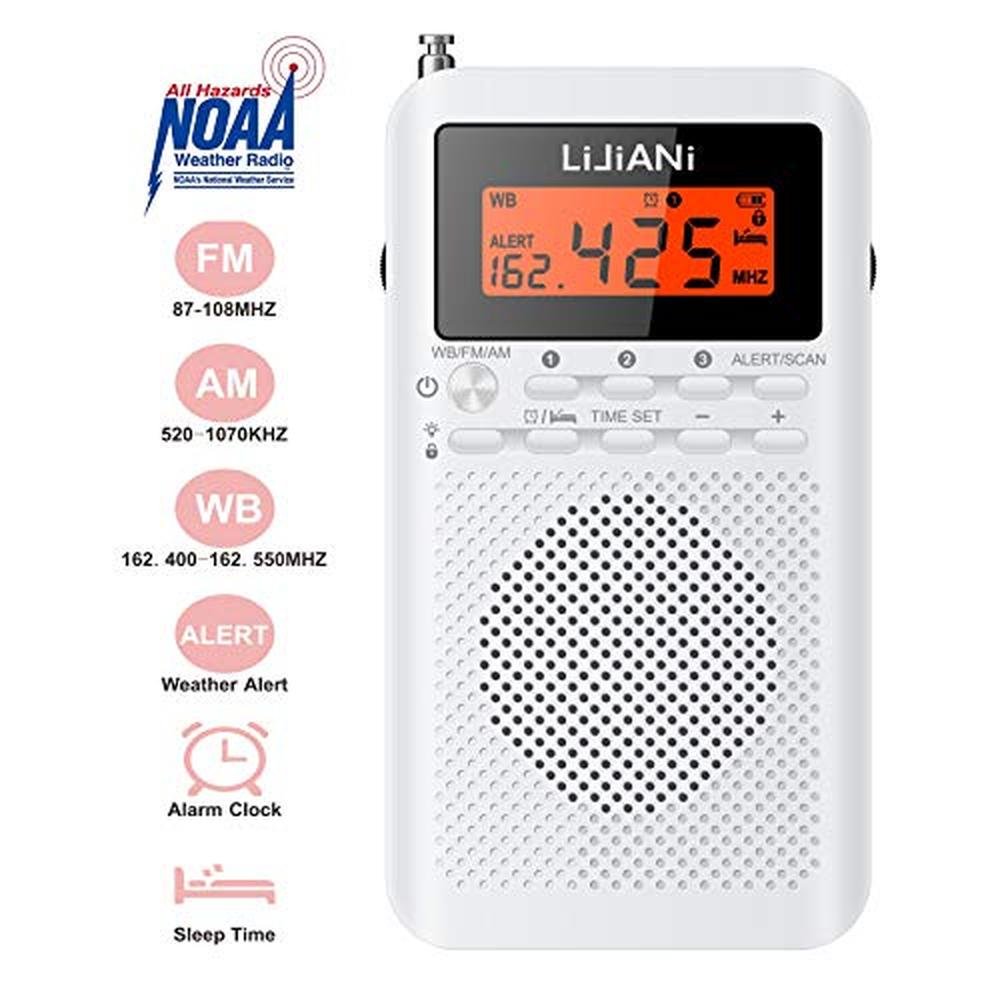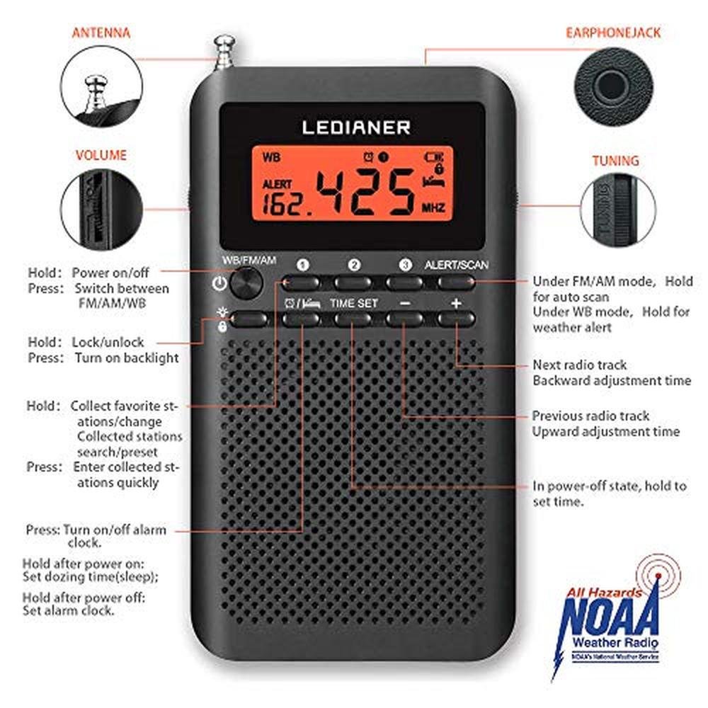 Our radio with AM/FM/ NOAA weather Alert radio.can automatically or manually get weather broadcasts from 7 NOAA stations at a crystal-clear sound. This weather radio can automatically monitor and alert hazard weathers in your area like hurricanes, tornadoes and sever storms, earns a critical time for you to get full preparation advance, keeping you and your family safe with this noaa radio. Small size:4.9*2.7*0.8 IN, convenient for you to carry or put in thee mergency bag.Powered by 2 AA batteries, even in power outage you still can receive weather information from this portable transistor radio, keep you update with lasted news.when the battery is taken out, The time memory will belost in 30 seconds. Please install a new battery within 30 seconds. Please donot turn on the backlight when changing the battery.The package does not contain batteries. Please purchase AA batteries separatelyFM: 87-108 MHZAM: 520-1710 KHzNOAA Weather:162.400/ 162.425/ 162.450/ 162.475/ 162.50/ 162.525/ 162.55 (continuous band)