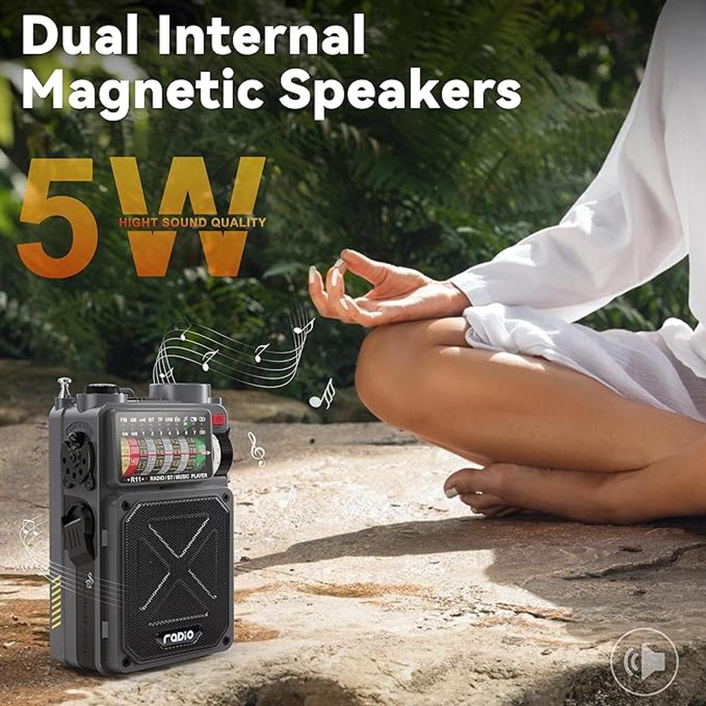 - Enjoy Your Favorite MusicThis emergency crank radio connects to Bluetooth 5.0 for use as an audio player, and the built-in 5-watt magnetic speaker provides you with superb sound quality so you can enjoy your favorite music. There is a 3.5mm headphone jack so you can use headphones for quiet listening. Also, the radio has access to a USB driveTFMicro SD card slot.
