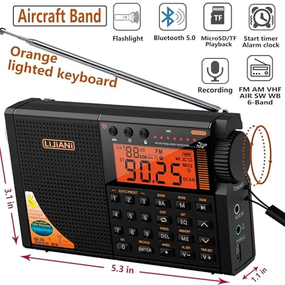 Shortwave Radio AIR/VHF/AM/FM/SW/Weather Bands Transistor with Bluetooth/TF Card/Flashlight,Key Backlight, Digital Record, Alarm Clock,Sleep Timer,Powered by AA Battery