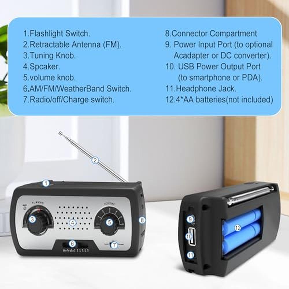 Our reliable Weather Radio equipped with AM/FM/WB functionality, it ensures you're always connected to the latest updates from NOAA. Be prepared for any emergency with automatic alerts for severe weather warnings, keeping you and your family ones safe. Its compact design make it perfect for outdoor adventures, camping trips, or simply keeping in your emergency kit at home. Plus, the built-in flashlight provides illumination during power outages or low-light situations. Stay informed and stay safe with our Weather Radio. The Urageuxy Weather compact portable emergency radio is ideal for your emergency kit, bug out bag, coat pocket, or glove compartment. Urageuxy WR-1000 compact AM/FM/WeatherBand Radio will fit easily into your shirt or jacket pocket for convenience and easy portability. The WR-1000 includes a standard USB port for charging smart phones and other portable devices in an emergency. Because the WR-1000 uses standard 4*AA batteries, you are never without emergency power. The AM/FM/WeatherBand tuner lets you choose from the wide range of radio talk shows, music programming and weather broadcasts from NOAA. The built-in Speaker enables convenient listening anywhere, and the earphone jack permits private listening enjoyment and improved sound clarity in noisy environments. Additional features include an LED tuning indicator, a telescopic antenna, flashlight, and a carry strap.