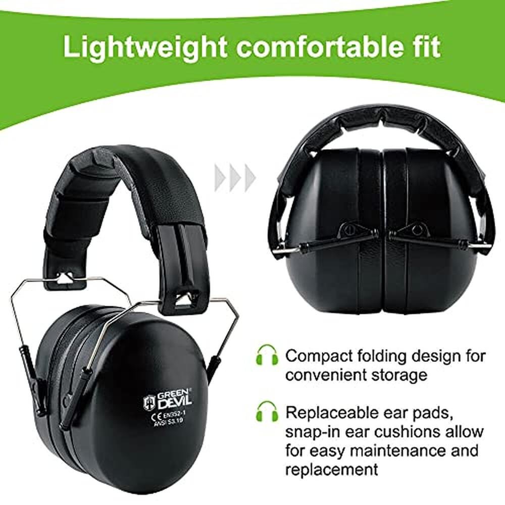 - Lightweight And Easy Storage:Compact folding design small volume for easy storage.GREEN DEVIL ear protection headphones comes with a carrying pouch, you just need to fold it up and put it in wherever you keep your hearing protection ear muffs.