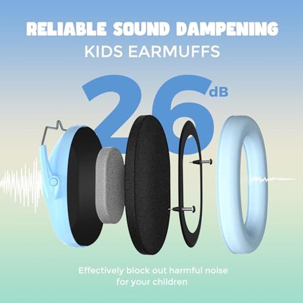 - Constructed by solid ABS shell and thickened noise dampening foam, the kids earmuffs offer SNR 26 dB rating, ANSI S3.19 (US) and CE EN352-1(EU) certified. Perfect for children who have sound sensitivity for airplane travel, fireworks, monster jam, sports events, concerts, movie theaters. Also ideal for kids concentration training